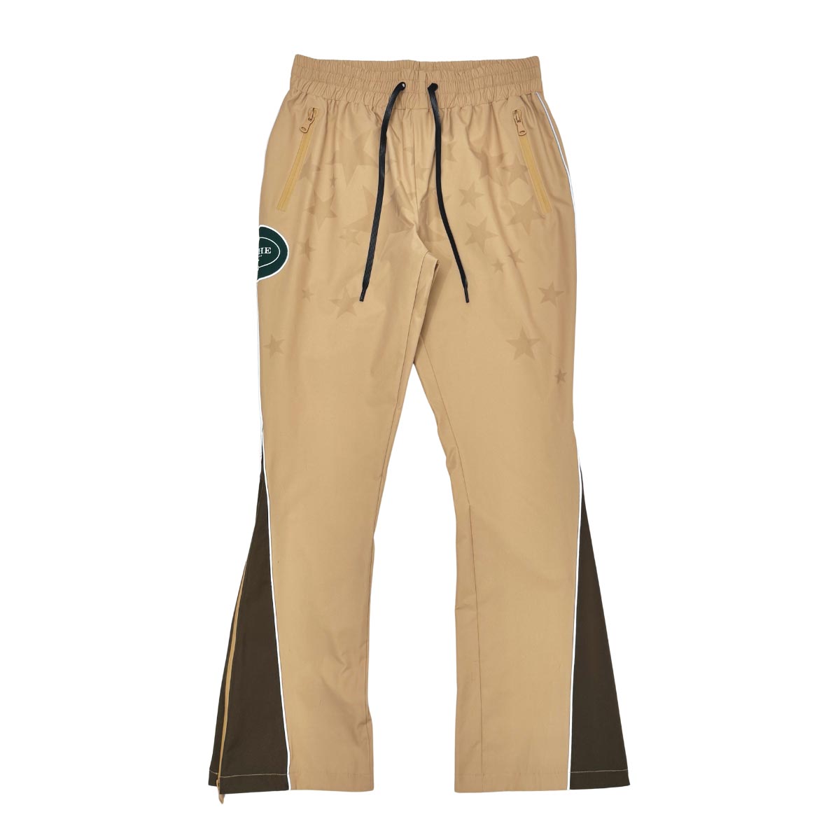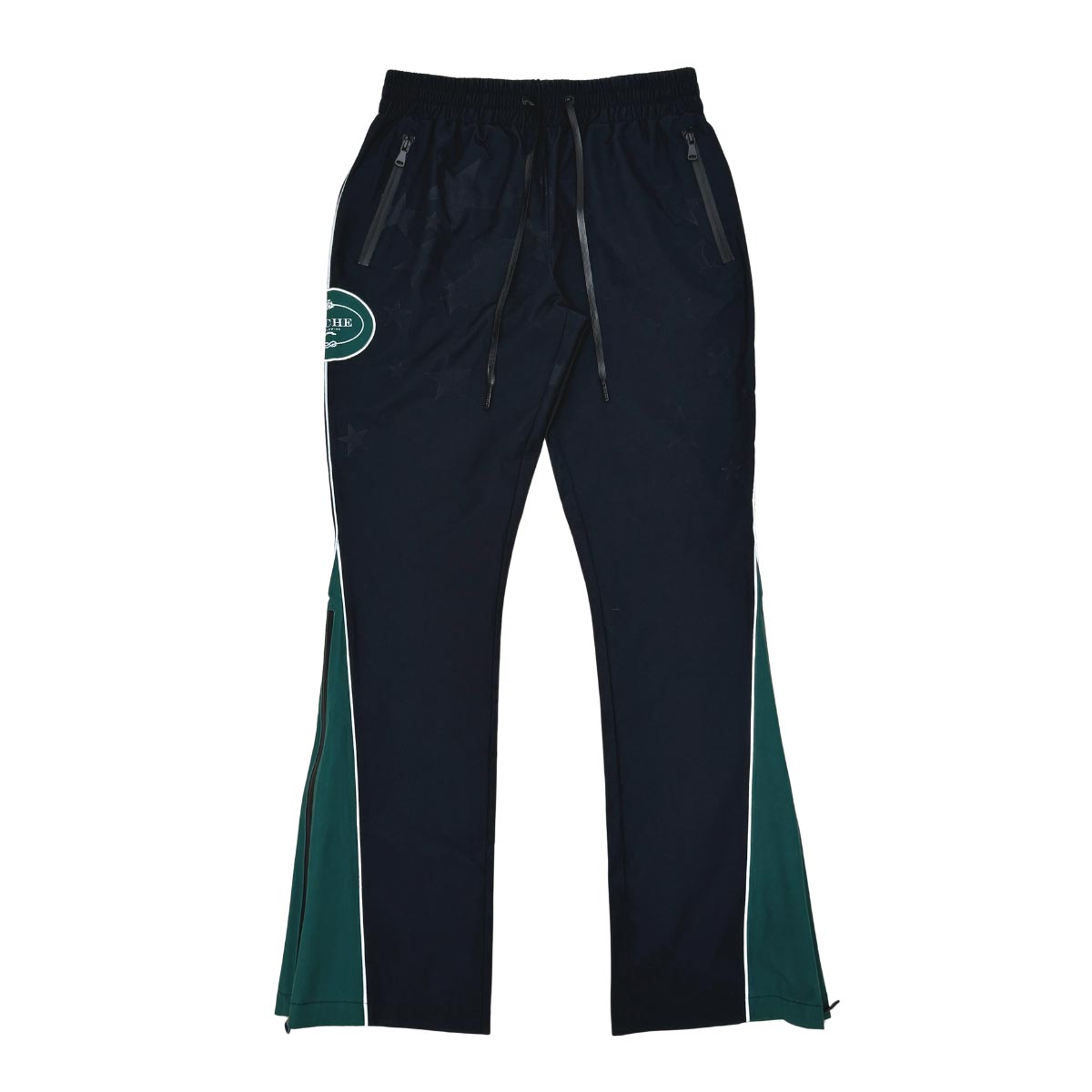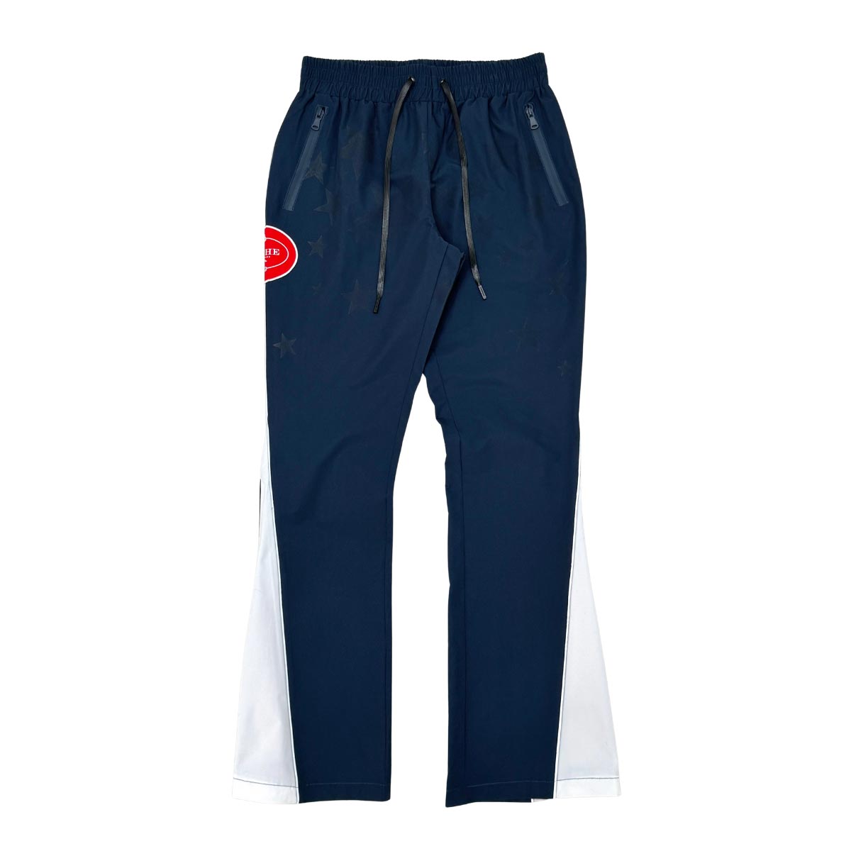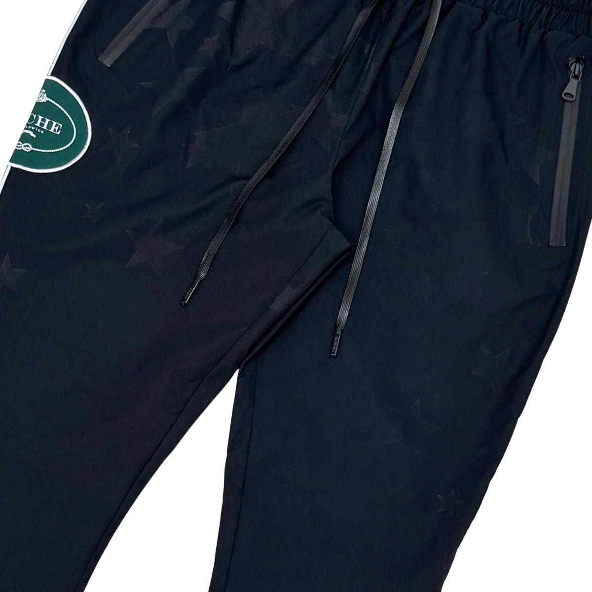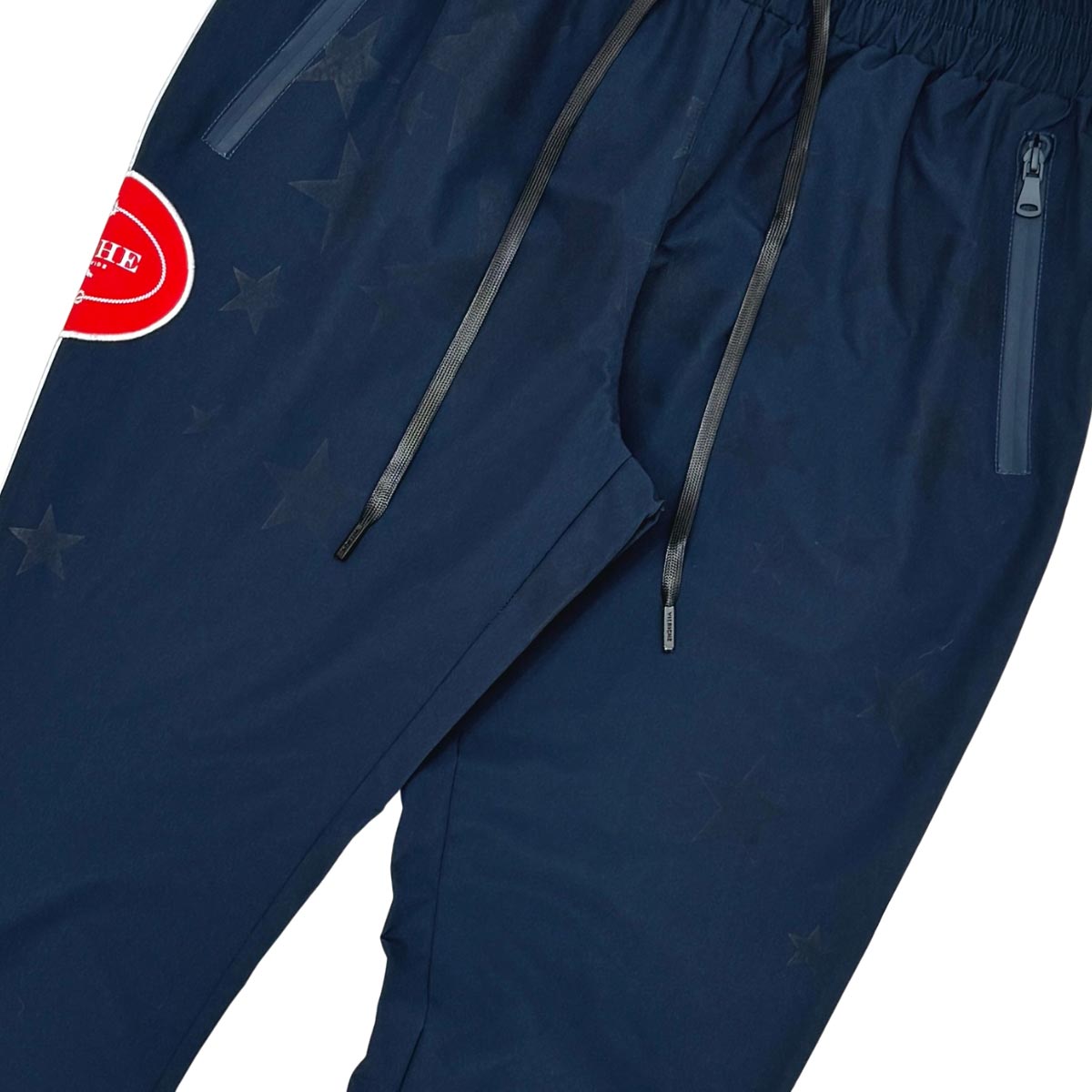 100% Poly-nylon jacket and pant set with with water-sealed zippers on front opening, pockets, and bottom pant opening, as well as printed stars on the body and sleeves, and logo appliques on front back and leg.
