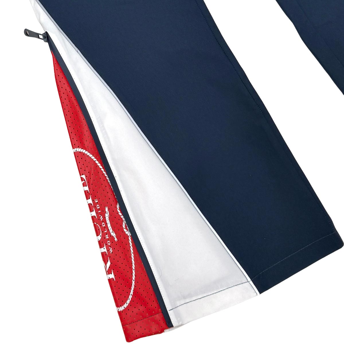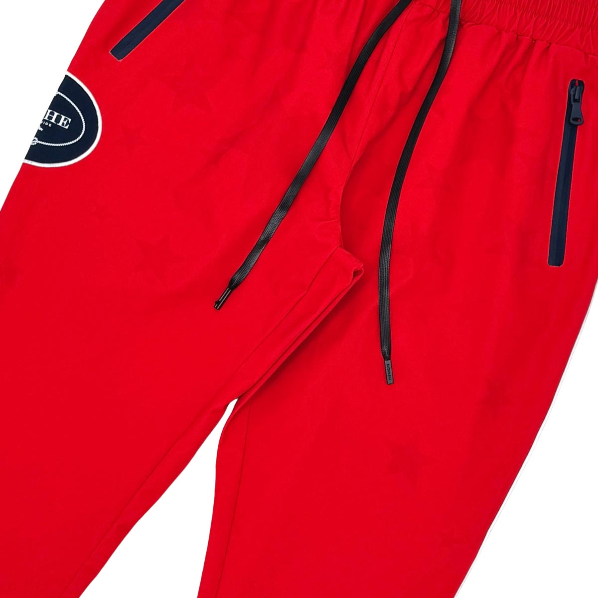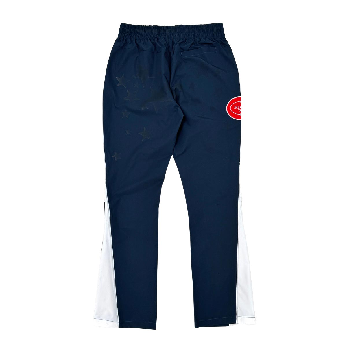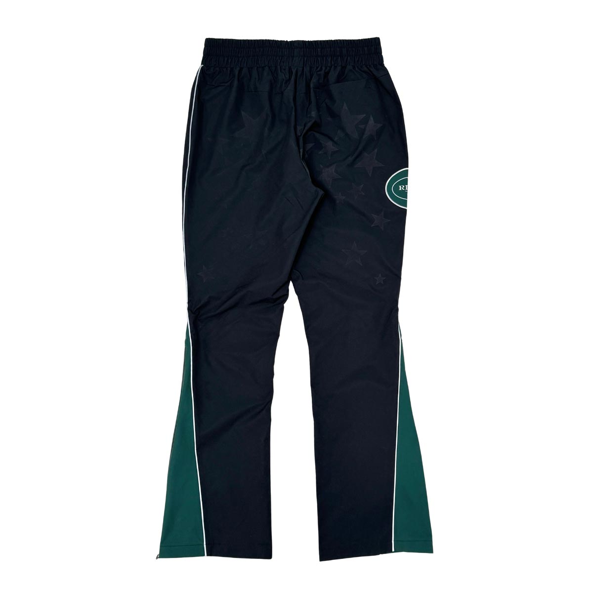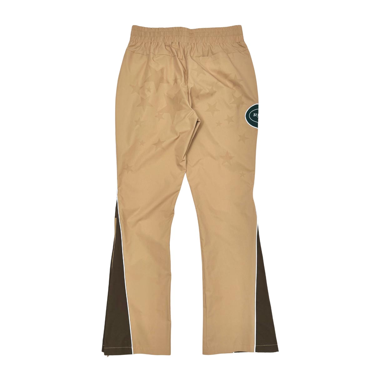 100% Poly-nylon jacket and pant set with with water-sealed zippers on front opening, pockets, and bottom pant opening, as well as printed stars on the body and sleeves, and logo appliques on front back and leg.