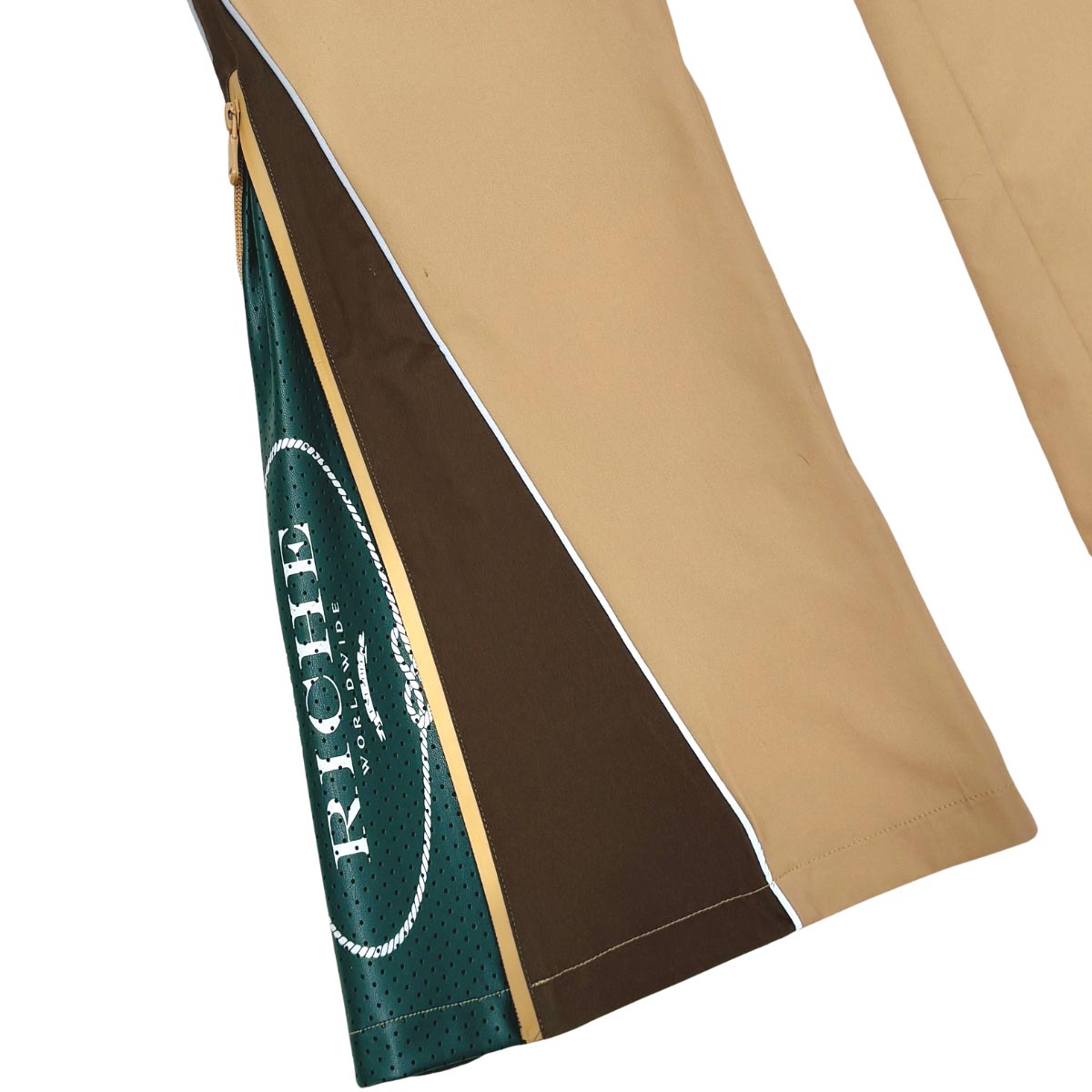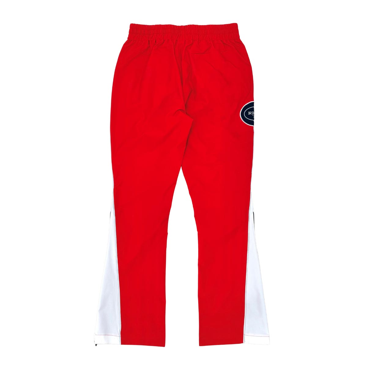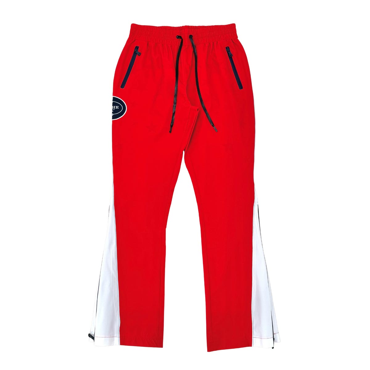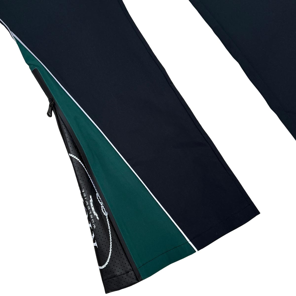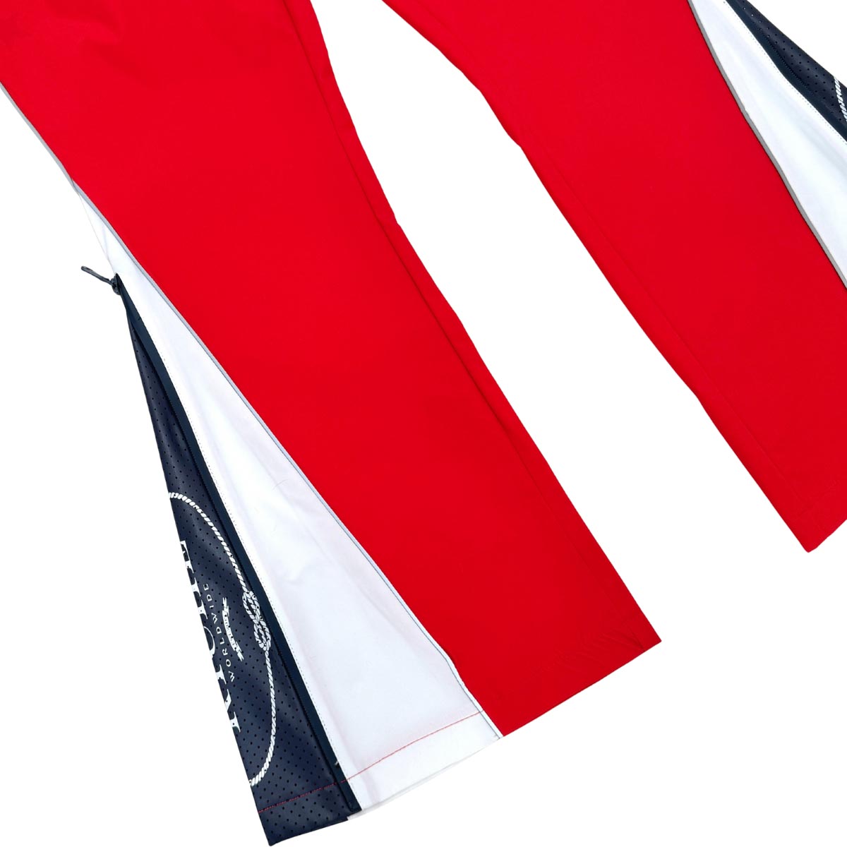 100% Poly-nylon jacket and pant set with with water-sealed zippers on front opening, pockets, and bottom pant opening, as well as printed stars on the body and sleeves, and logo appliques on front back and leg.