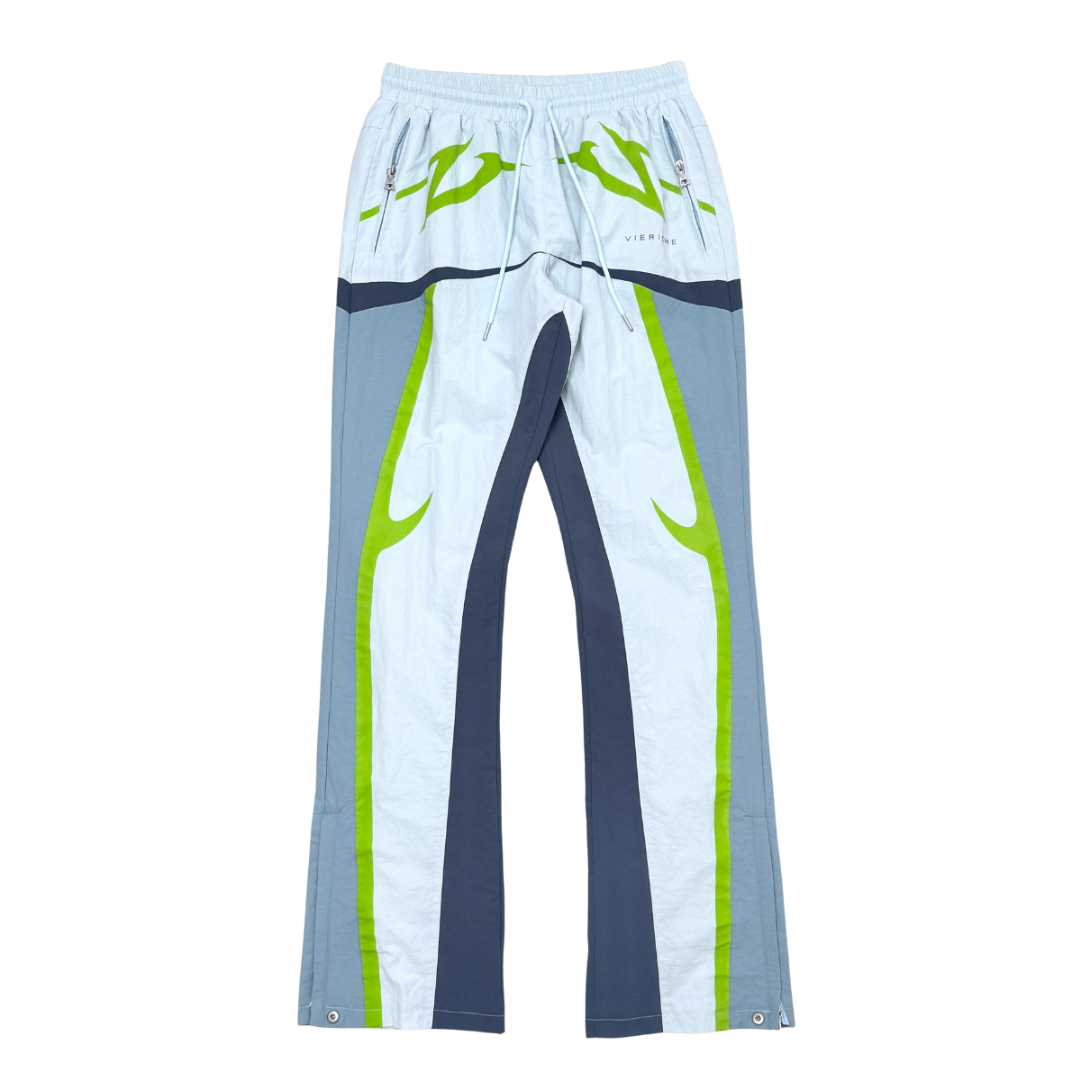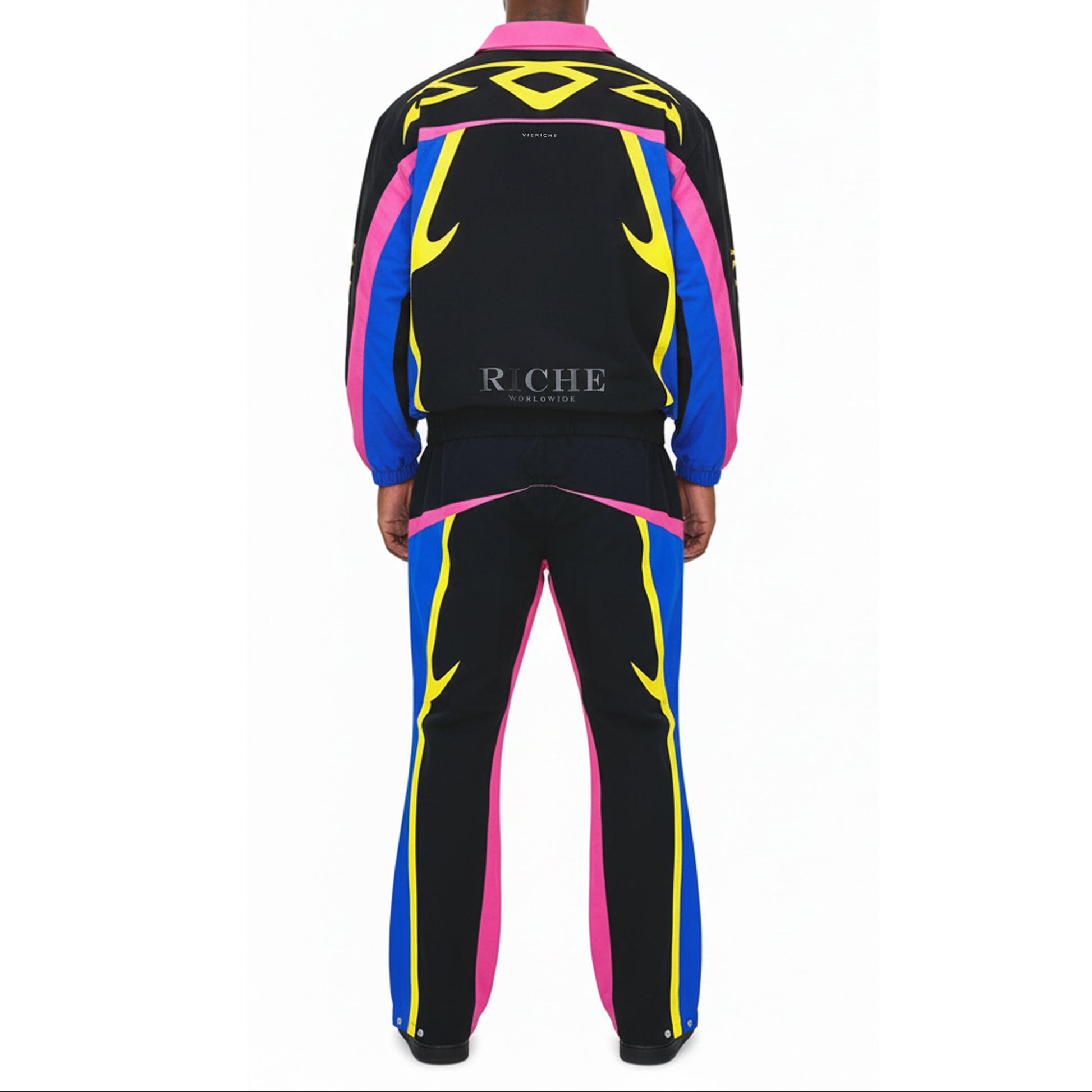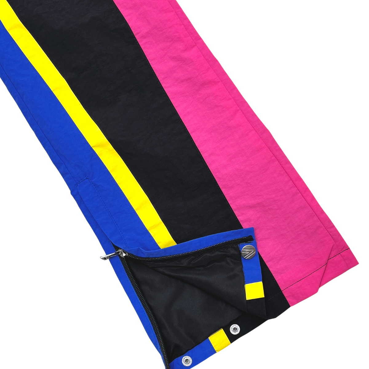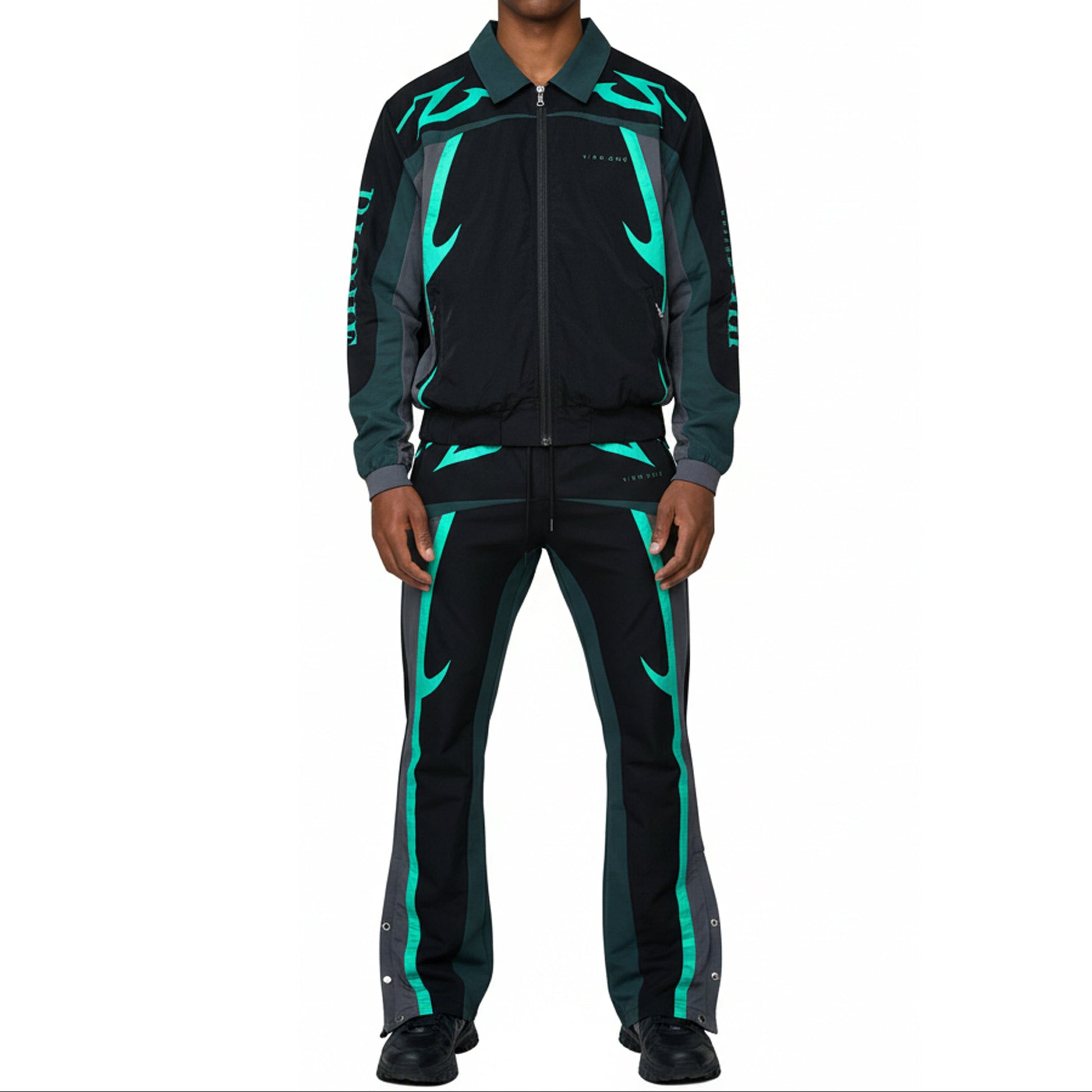 Nylon jacket and pants set with multi colored accents. flared cut pants with tribal detailed print on jacket and pants for added touch of style. drawstring cord for adjustable waist size and snap buttons at leg opening for adjustable fit and cut.