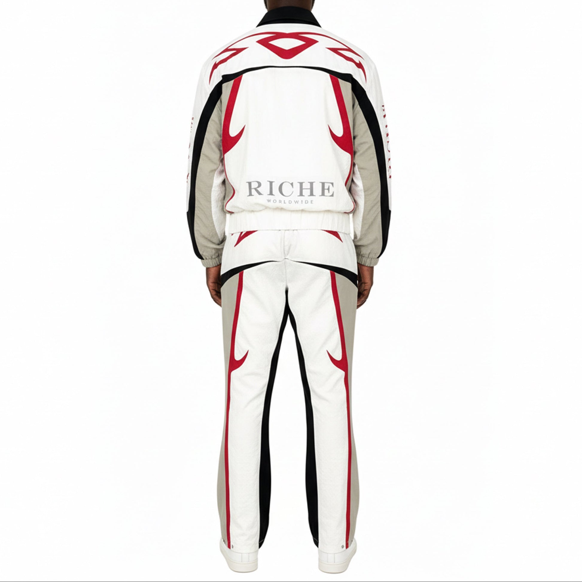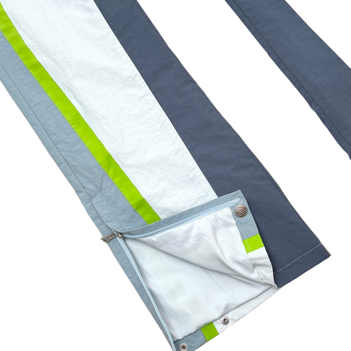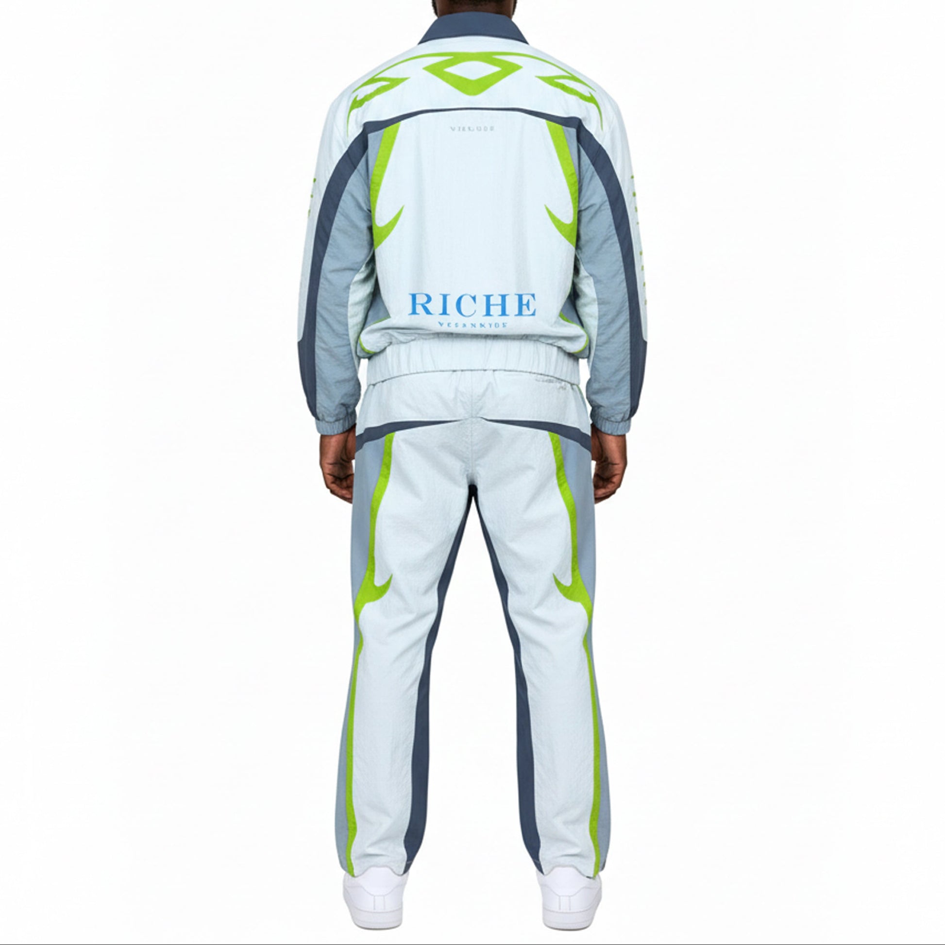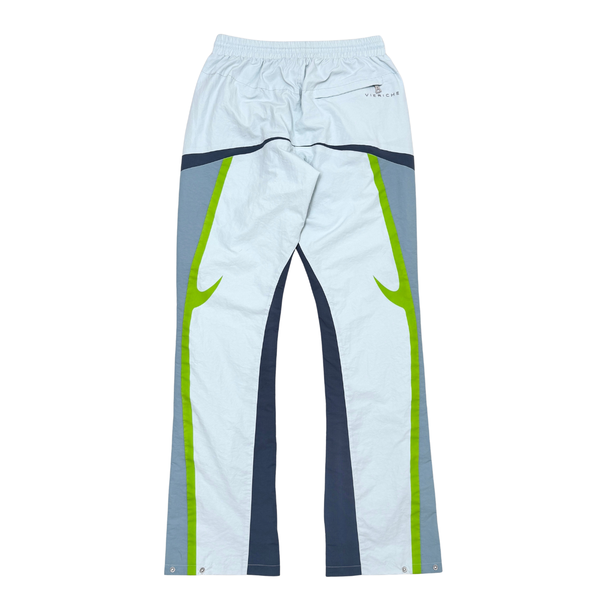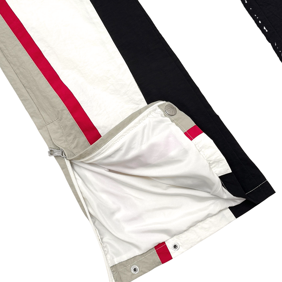 Nylon jacket and pants set with multi colored accents. flared cut pants with tribal detailed print on jacket and pants for added touch of style. drawstring cord for adjustable waist size and snap buttons at leg opening for adjustable fit and cut.