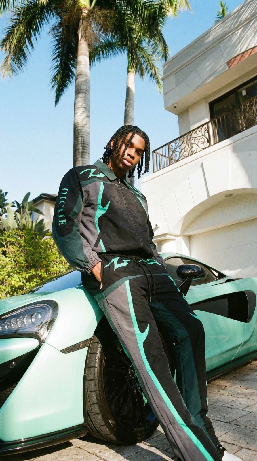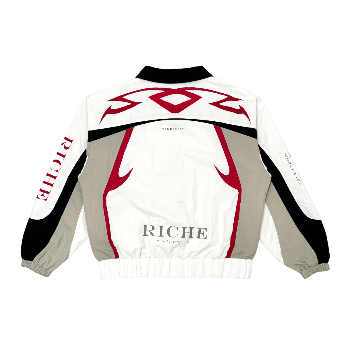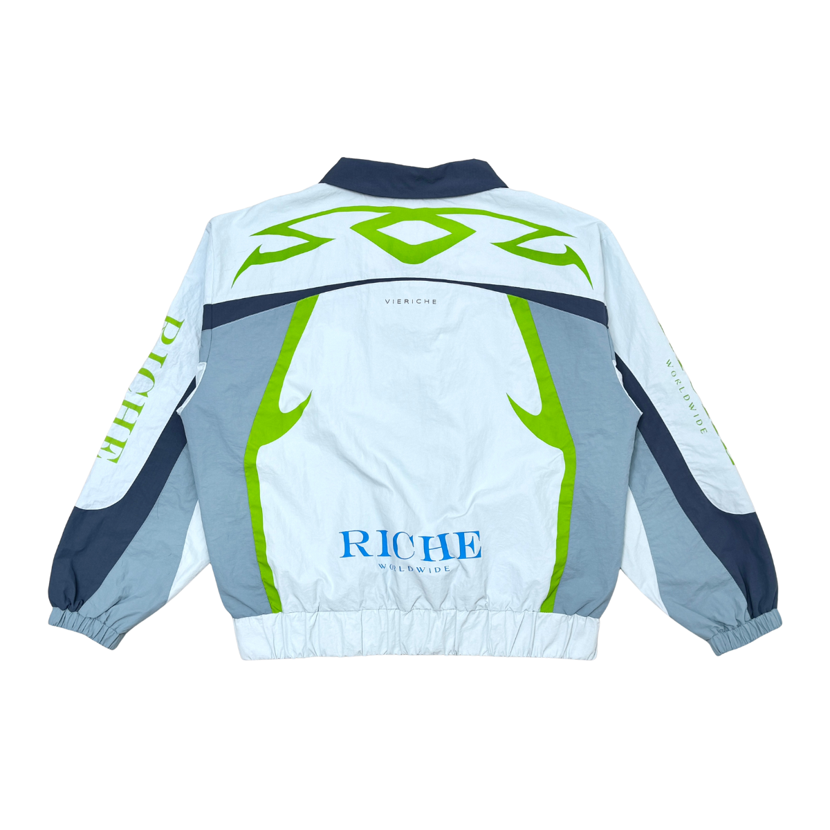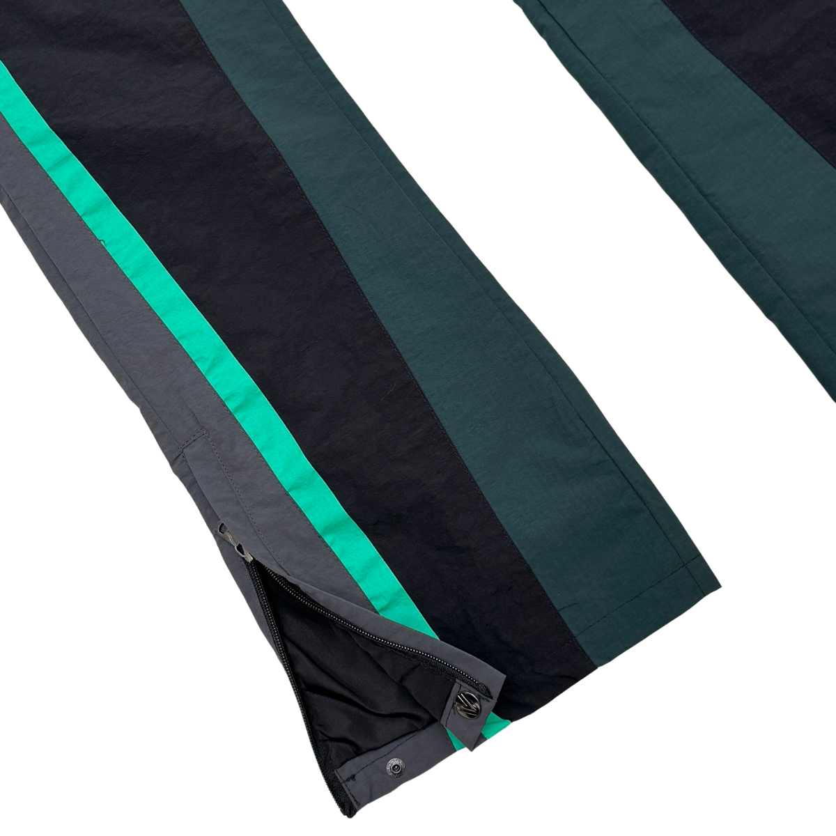 Nylon jacket and pants set with multi colored accents. flared cut pants with tribal detailed print on jacket and pants for added touch of style. drawstring cord for adjustable waist size and snap buttons at leg opening for adjustable fit and cut.