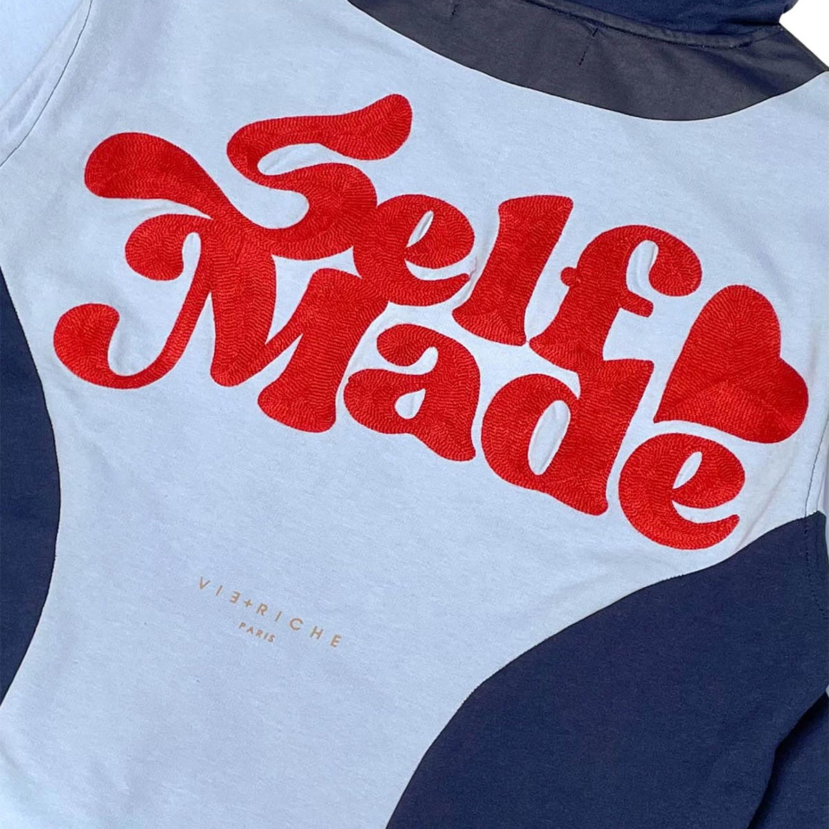 Fine knit 100% cotton french terry sweat pants with contrast color and fabric paneling details, water-sealed zippers, chenille patch, zippered bottom cuffs and wax-treated draw cord at neck.