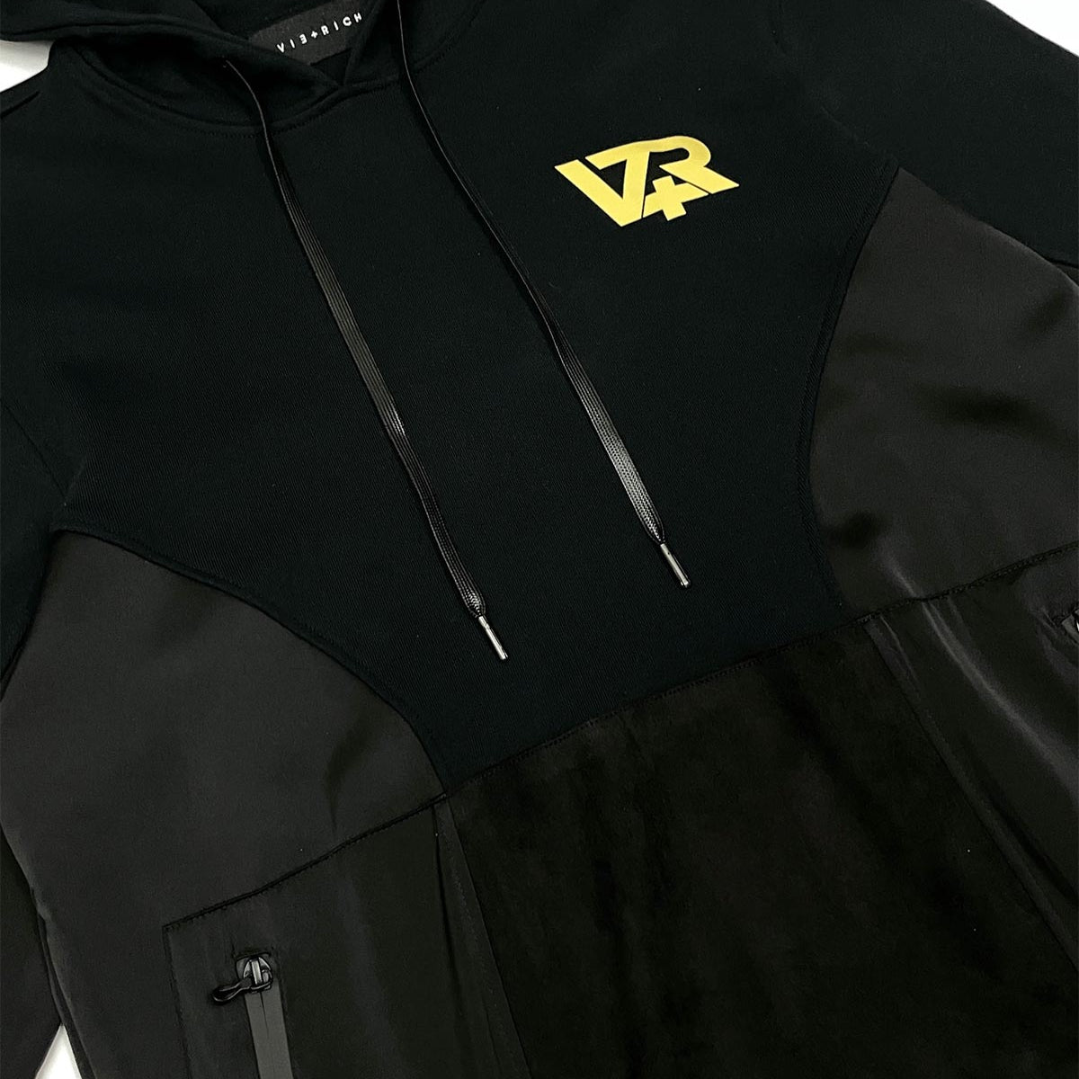 Fine knit heavyweight 100% cotton french terry hooded sweatshirt with tonal satin and microfiber suede paneling detail, zippered kangaroo pocket, printed logo on chest and rubber patch on back.