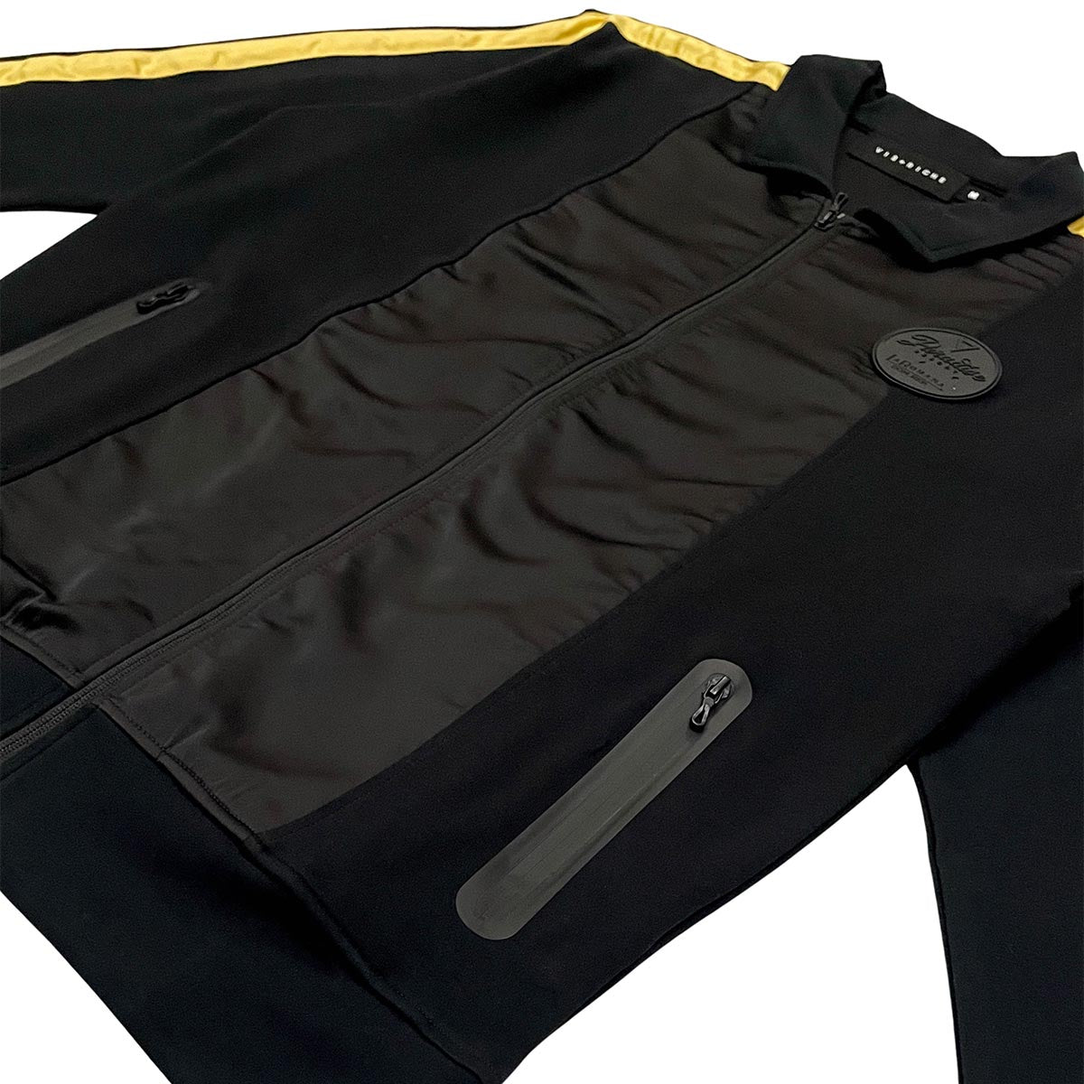 Heavyweight performance poly track jacket with tonal microfiber suede paneling, striped detail on sleves, rubber patch at left chest, waterproof zippered pockets and embroidery detail on back.