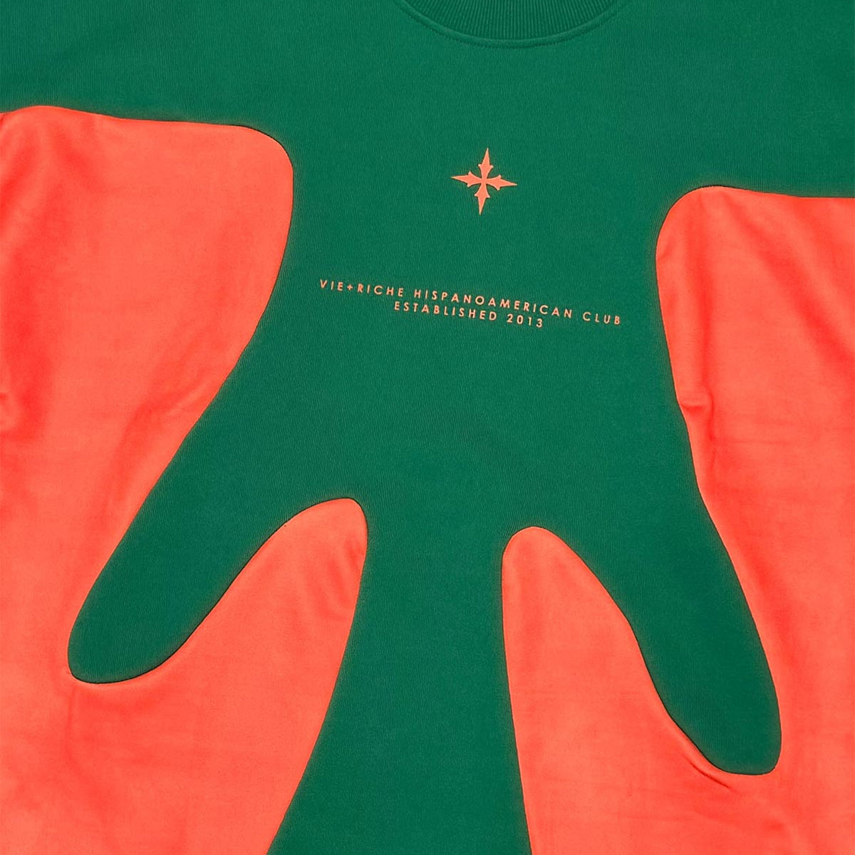 100% fine knit heavy weight cotton french terry tee shirt with microfiber suede contrast paneling and printed insignia on the chest.