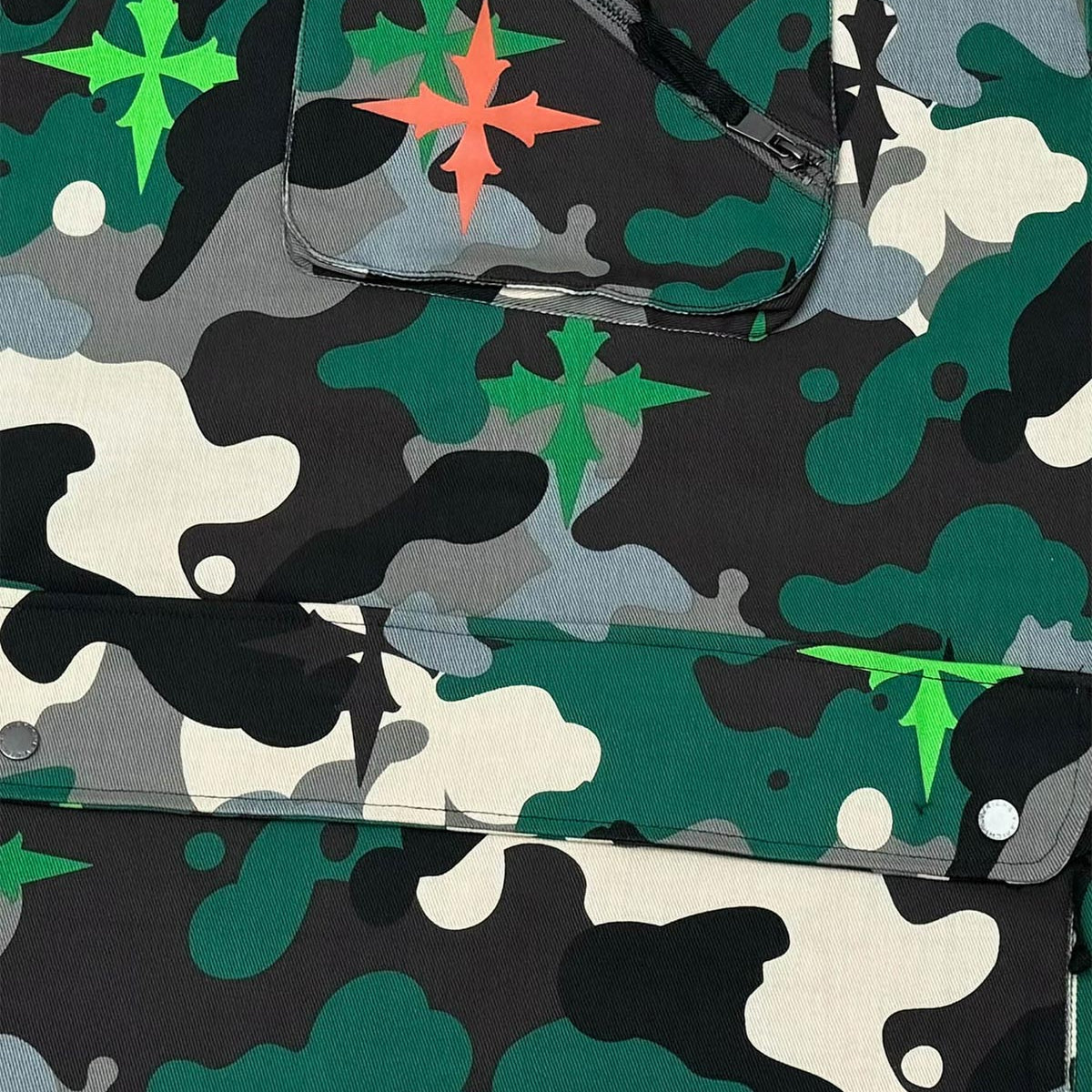 100% cotton canvas vest with patch pockets with zippers, printed insignia on front and back, and chenille embroidery application on front chest.