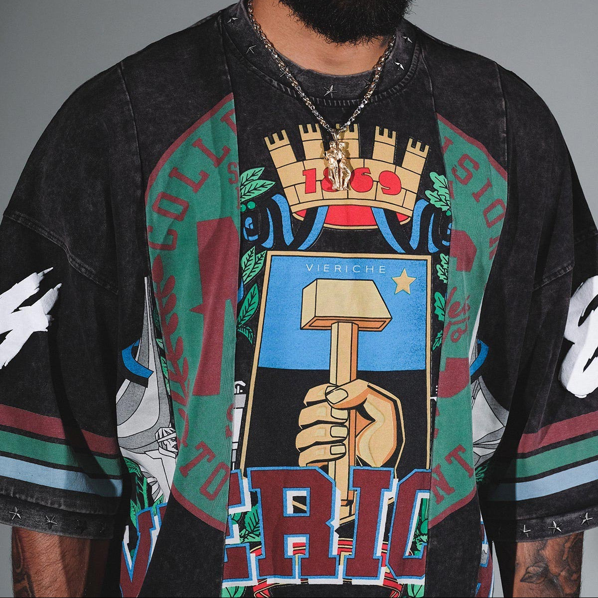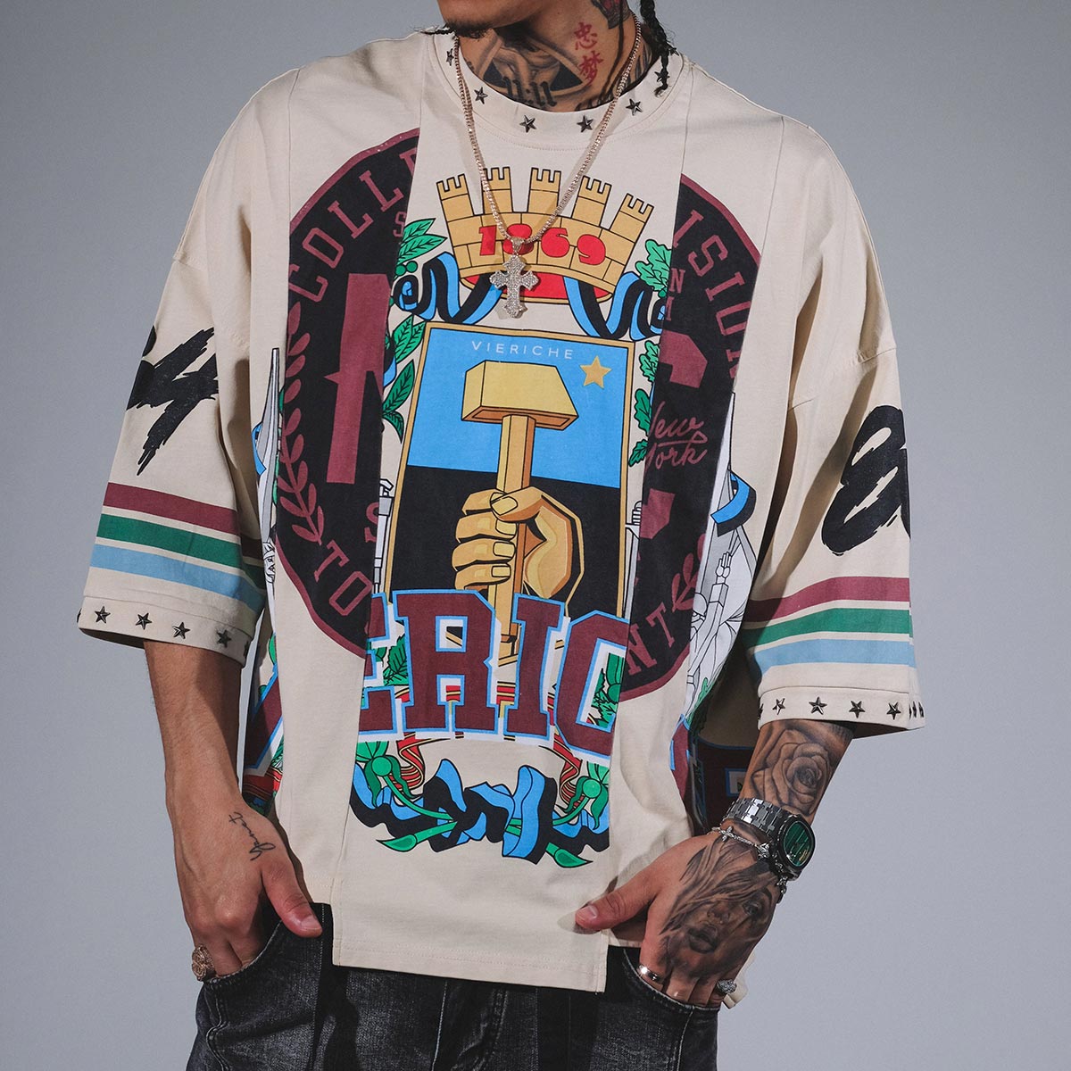 100% Fine knit heavyweight cotton jersey tee shirt with odd shaped panels and printed graphics on all panels.