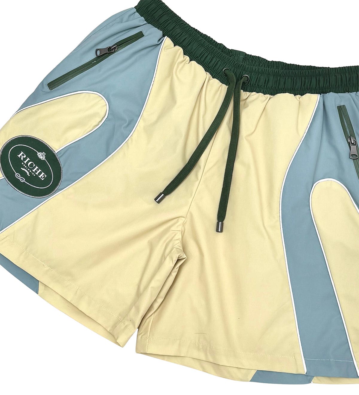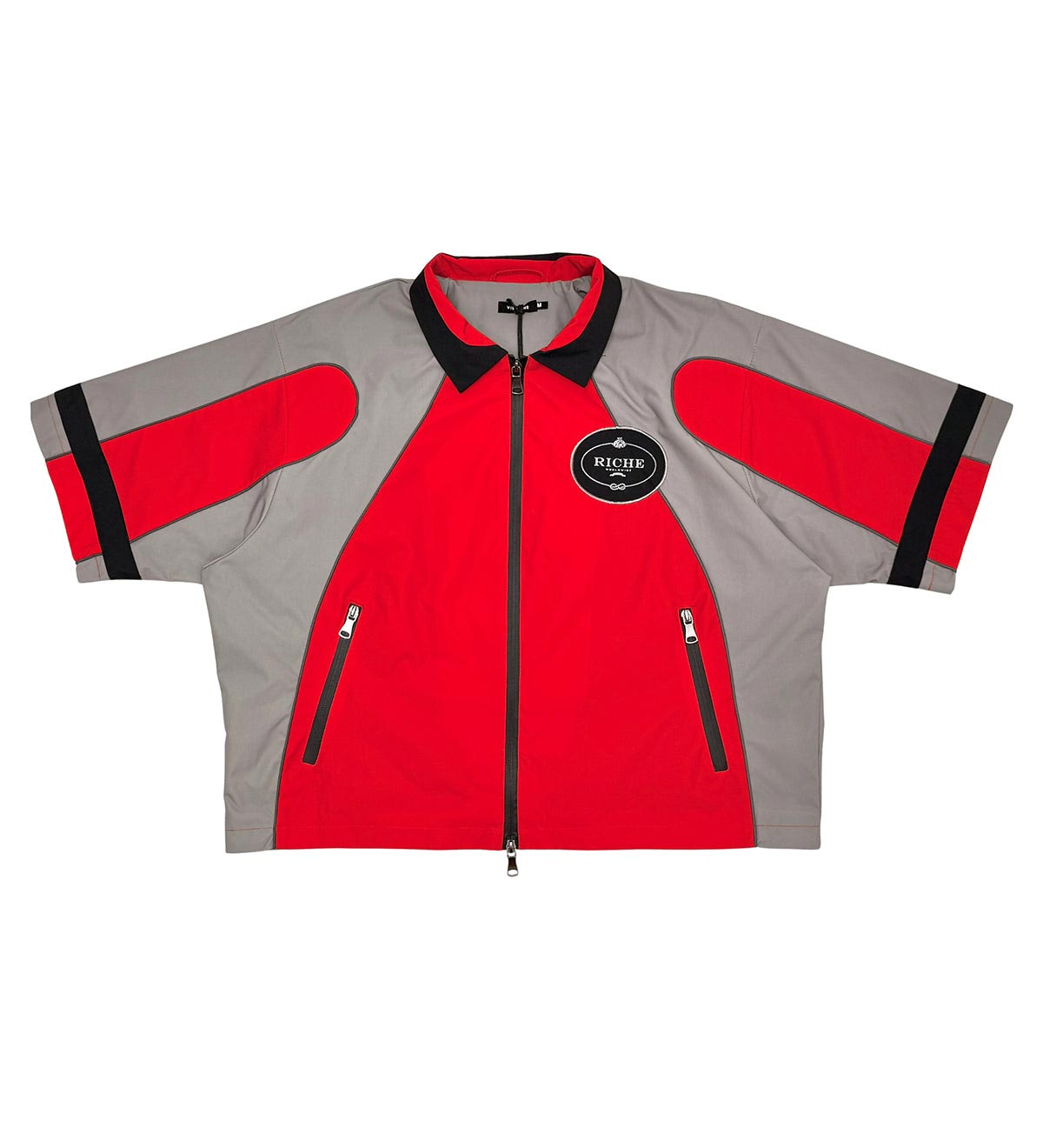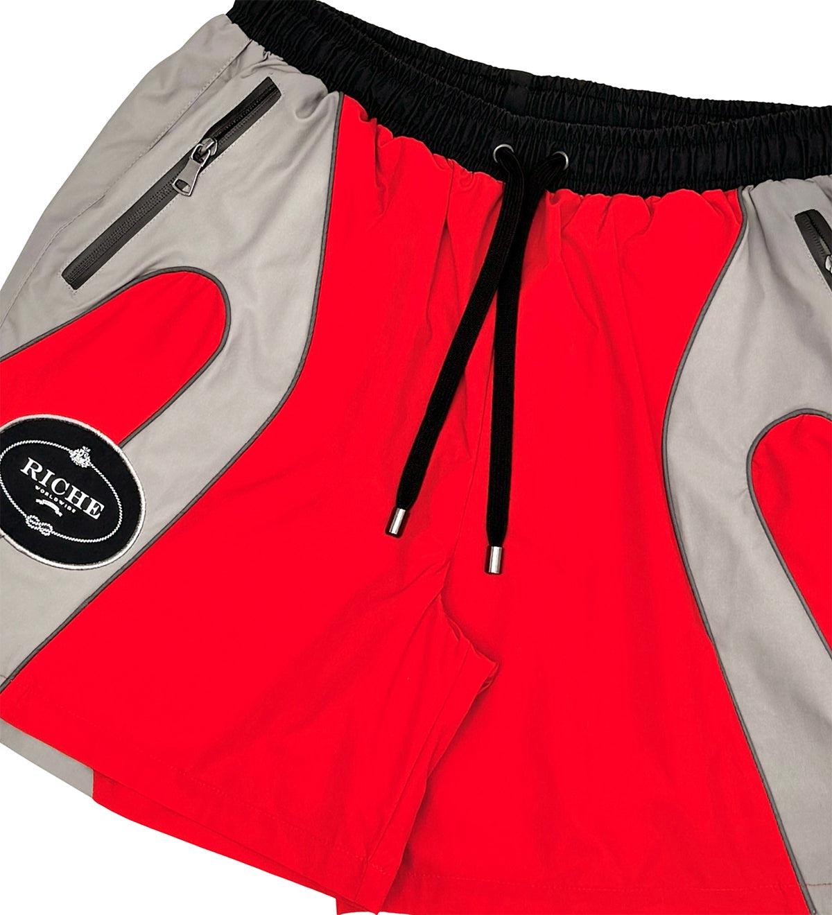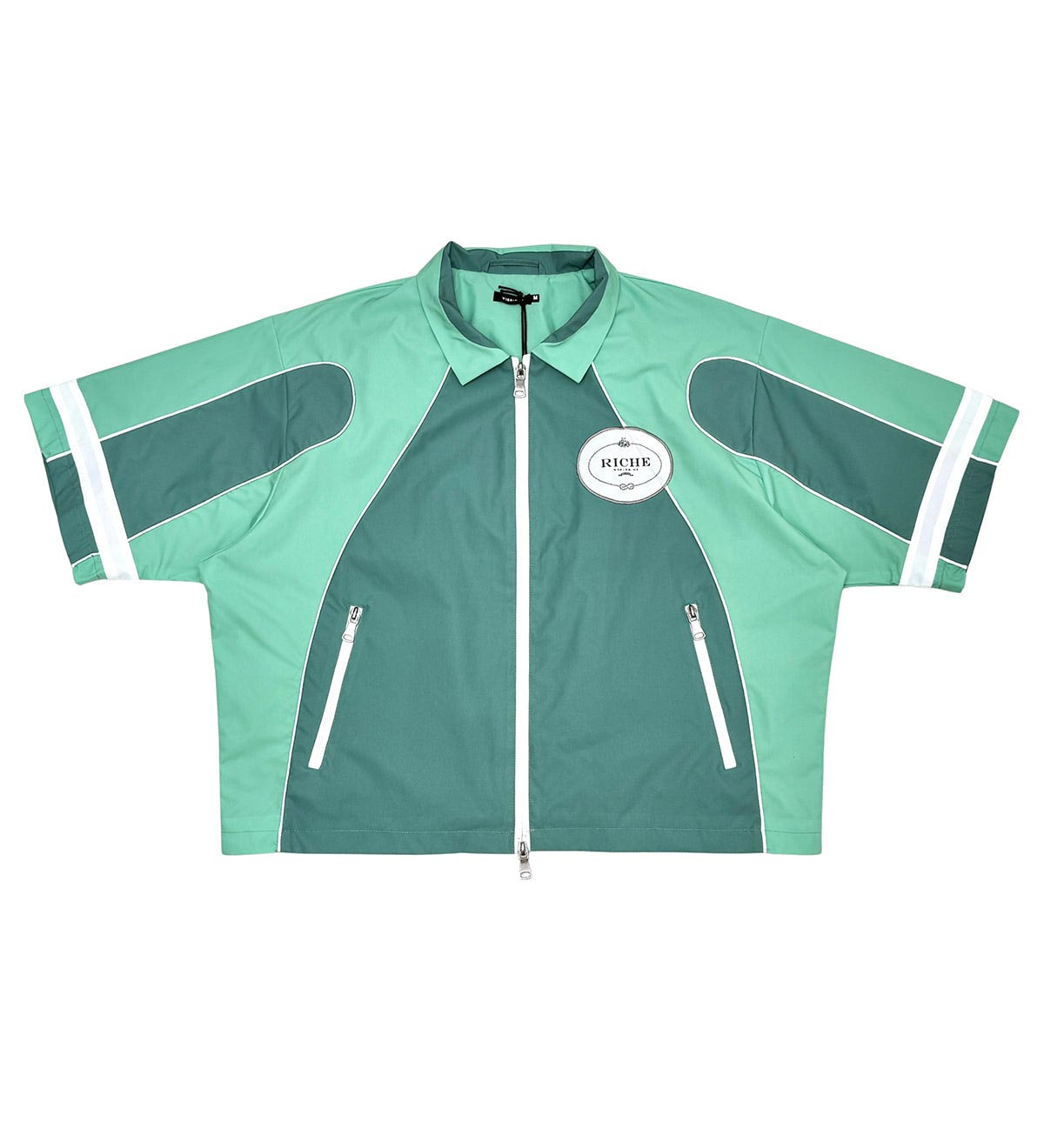 100% Polynylon short sleeve zipup jacket with contrast paneling detail, reflective piping detail, logo patch on front chest and back, and zippered pockets.100% Polynylon shorts with contrast paneling detail, contrast piping detail, logo patch on front leg, and zippered pockets.