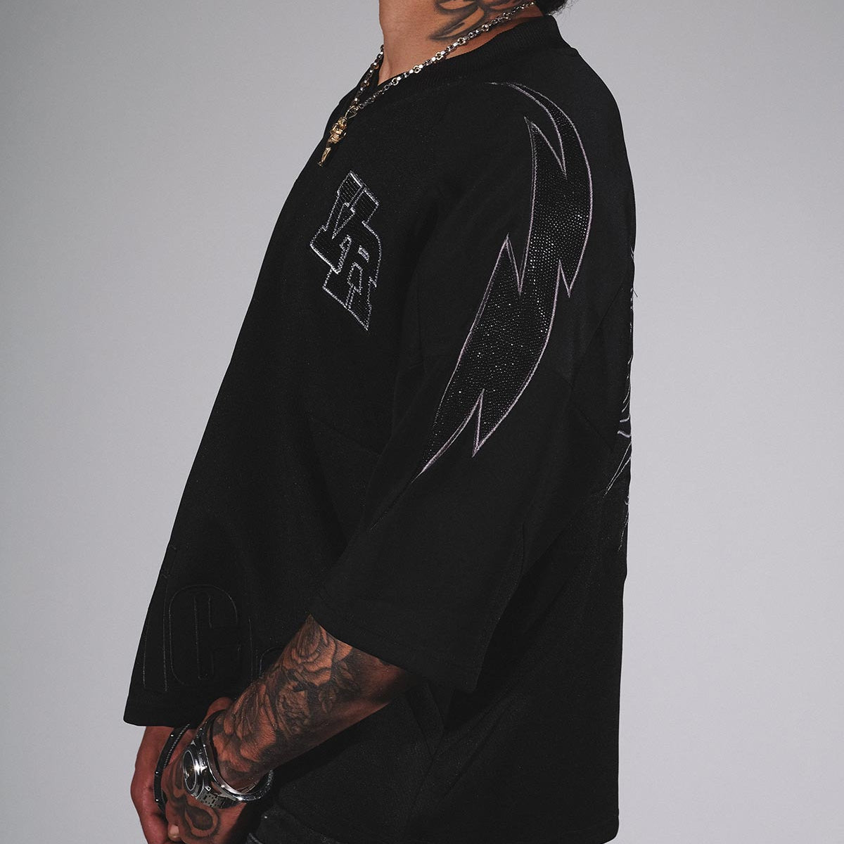 Heavyweight poly jersey and mesh crop football jersey with overlayed patches and printed graphics.