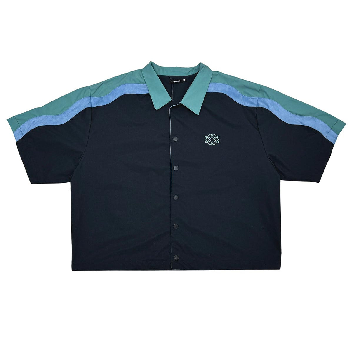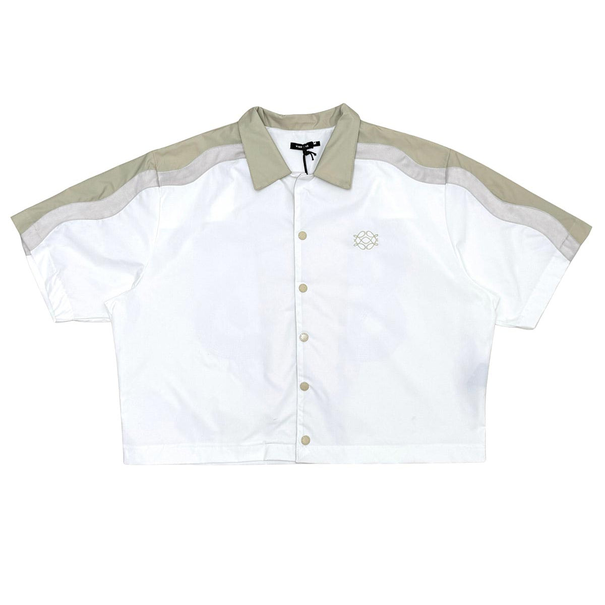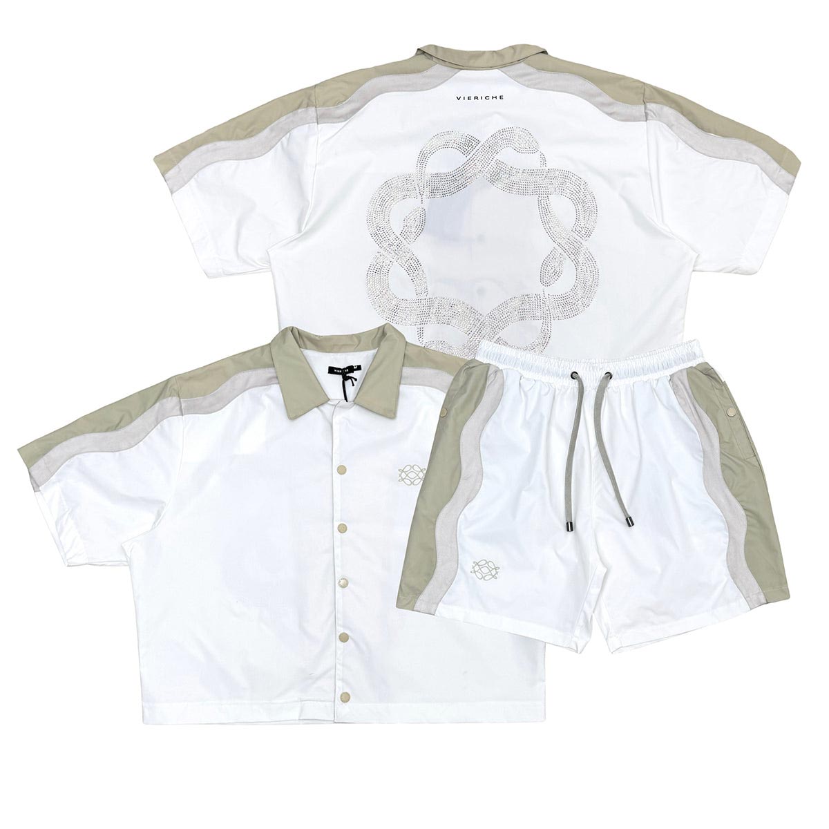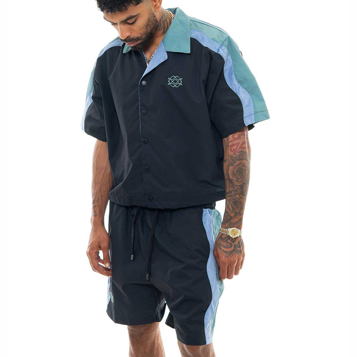 100% Poly-Poplin button up shirt with contrast paneling detail, and Logo print on chest, and stones applique on back. 100% Poly-Poplin shorts with contrast paneling detail, and Logo print on thigh.