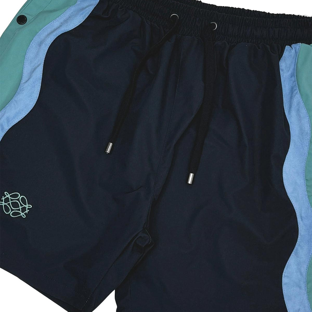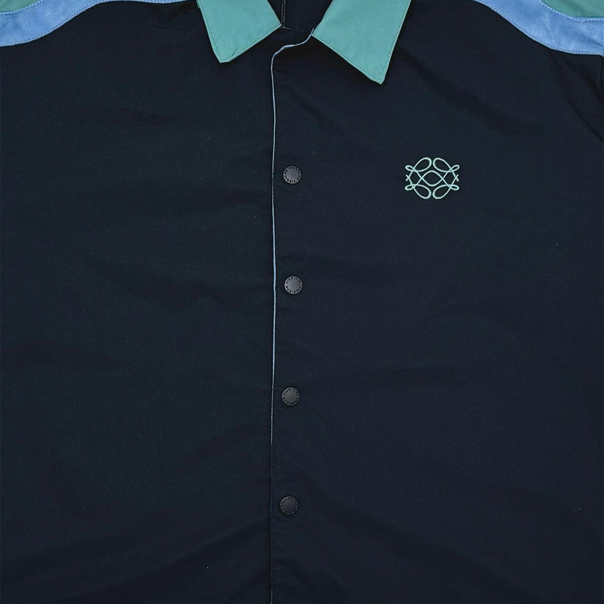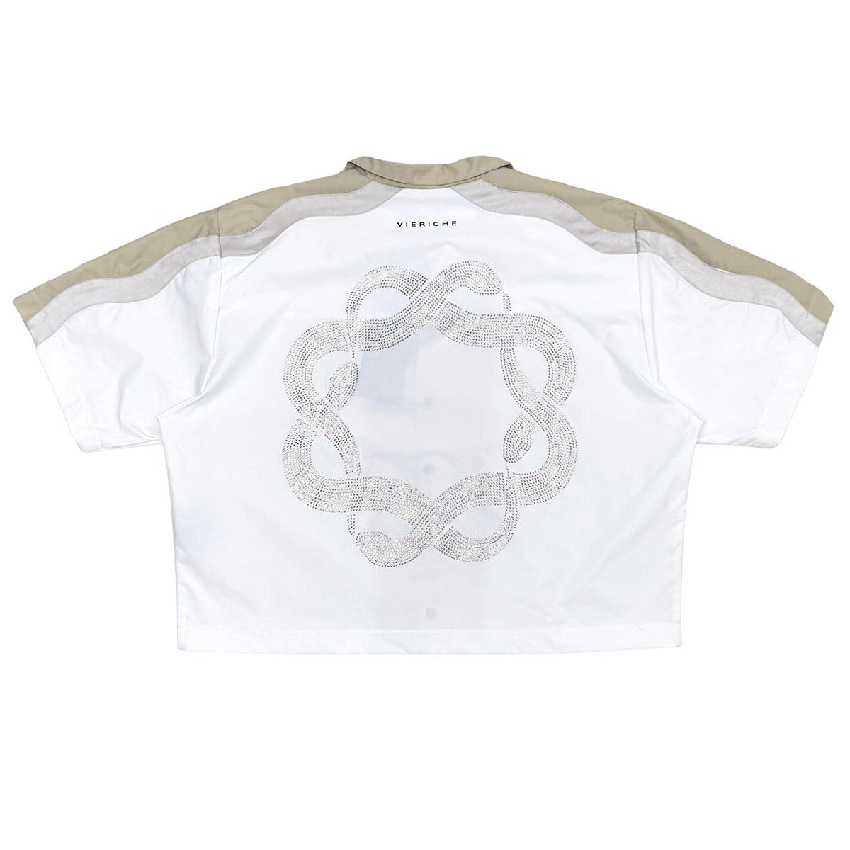 100% Poly-Poplin button up shirt with contrast paneling detail, and Logo print on chest, and stones applique on back. 100% Poly-Poplin shorts with contrast paneling detail, and Logo print on thigh.