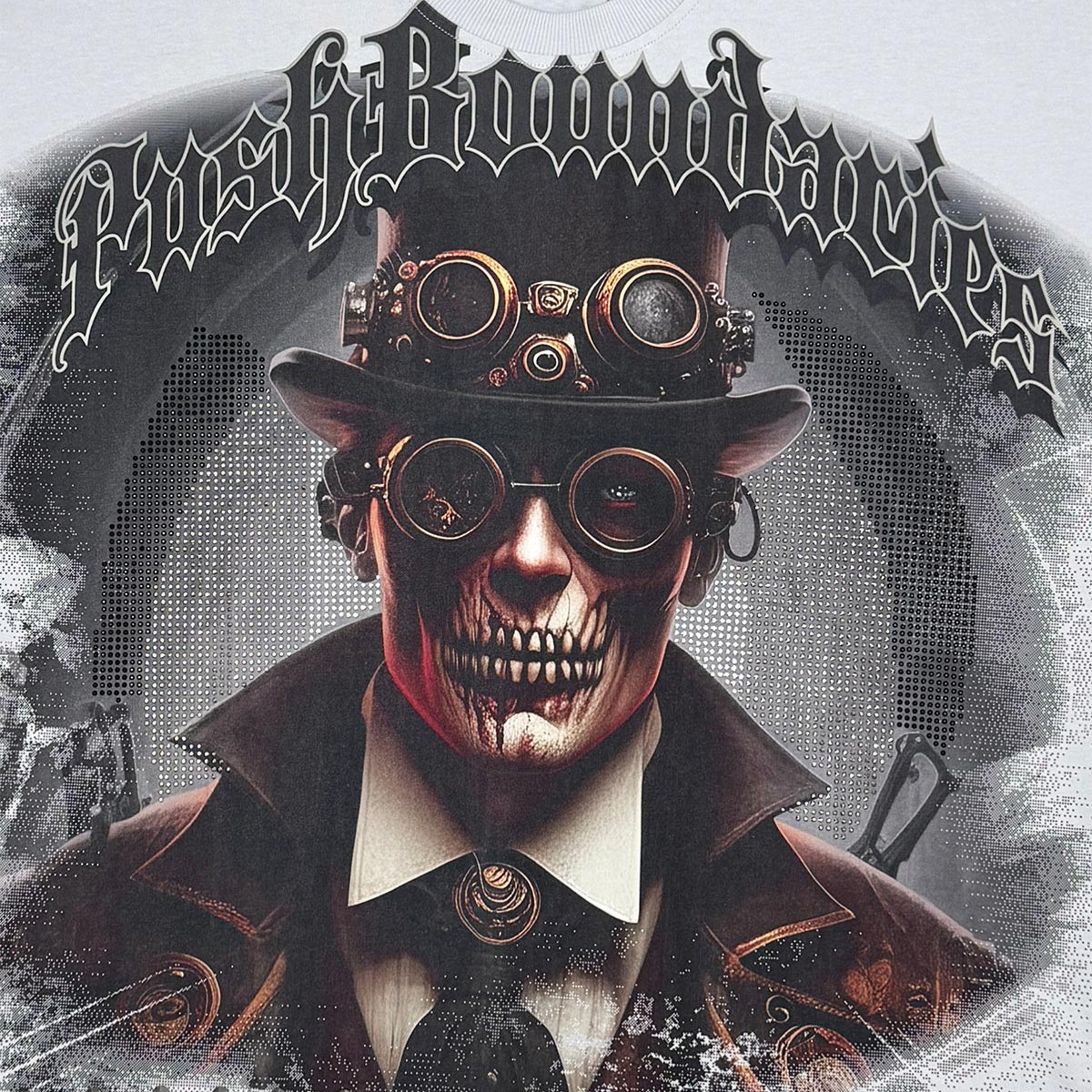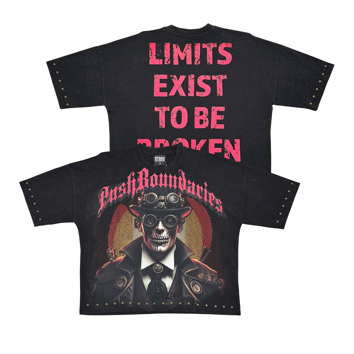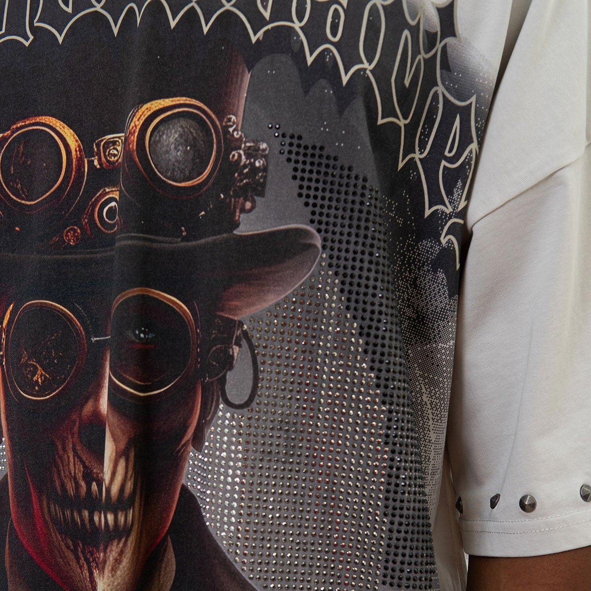 Pre-washed 300 gsm 100% cotton dtg print with rhinestones & studs.