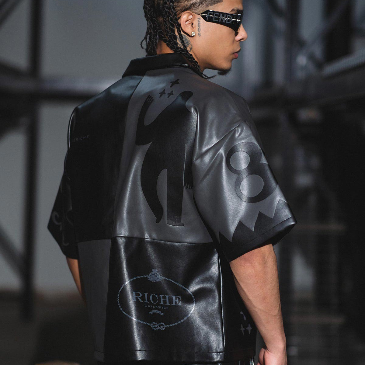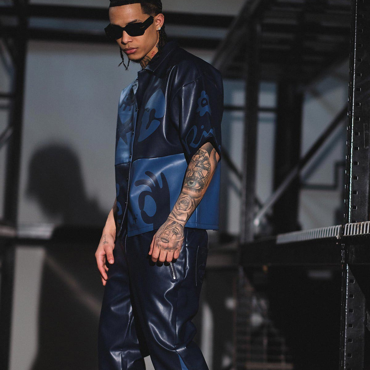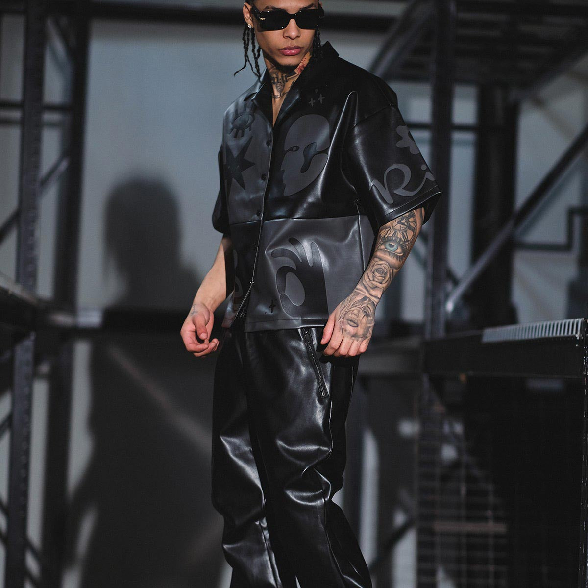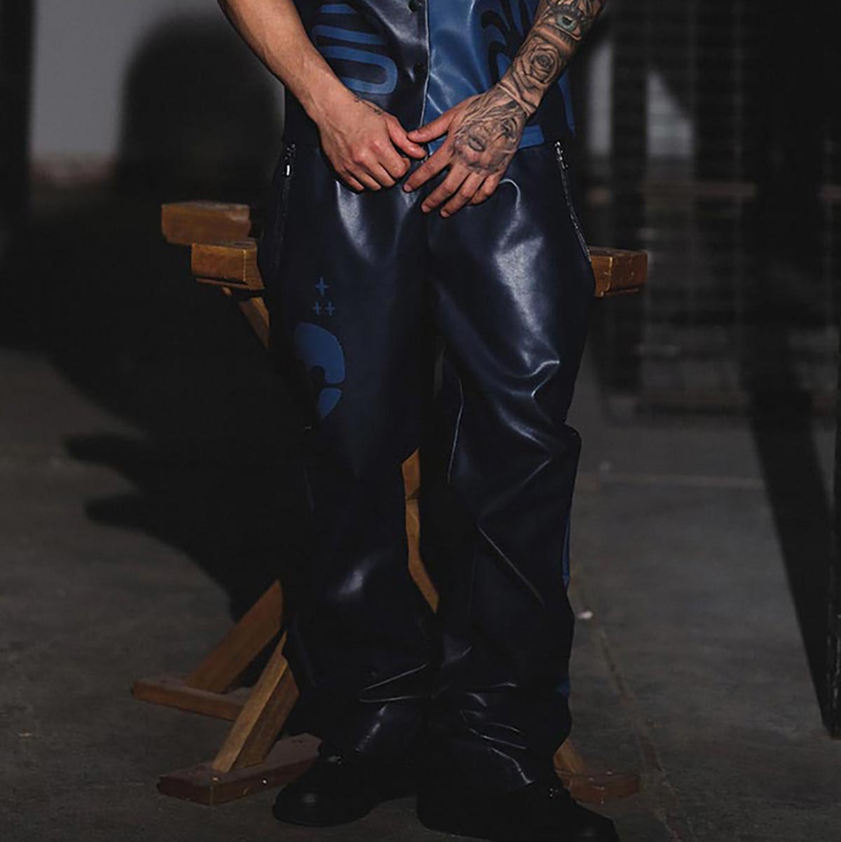 Vegan leather pants with contrast panels, self-fabric graphics all over, and zippered expandable leg opening at bottom.