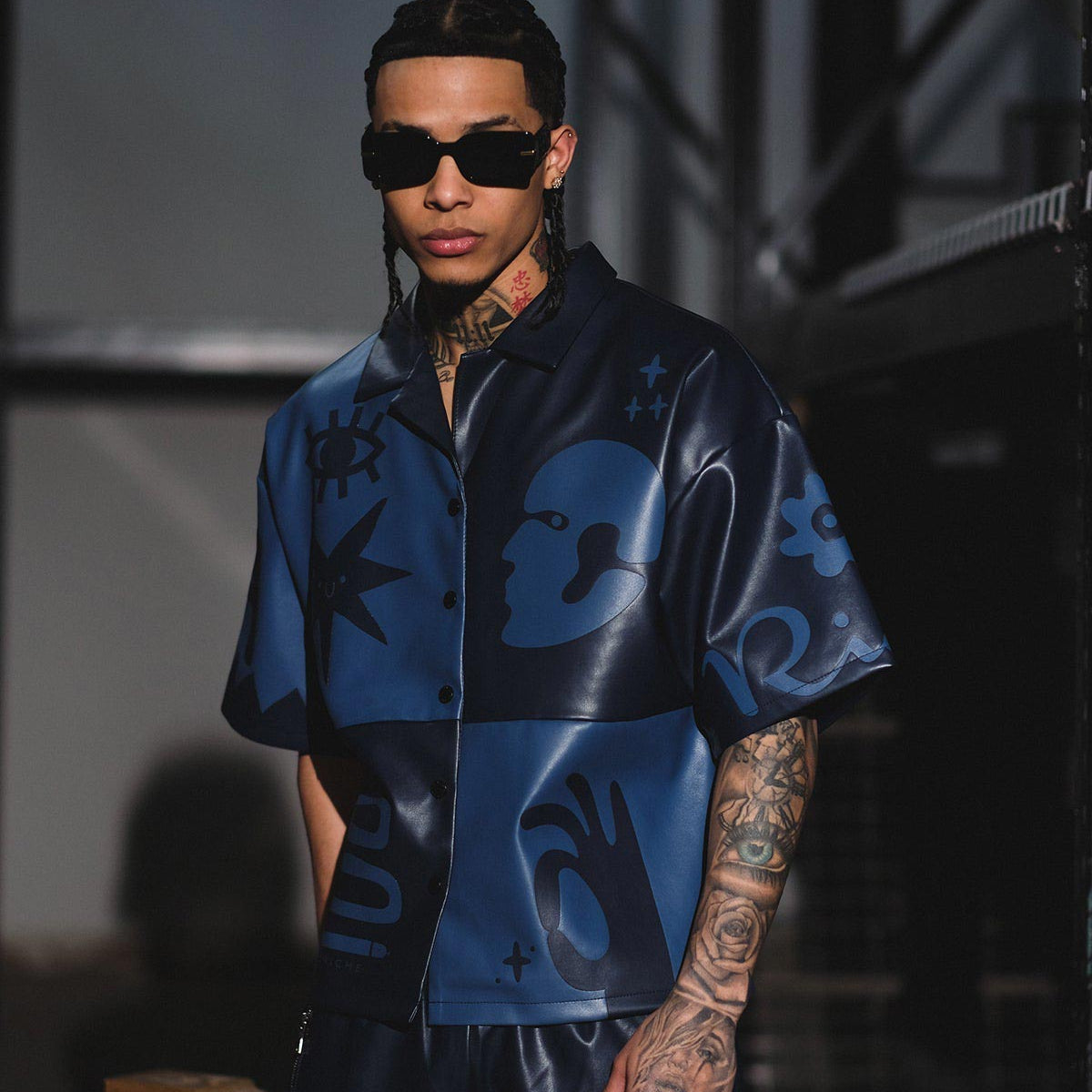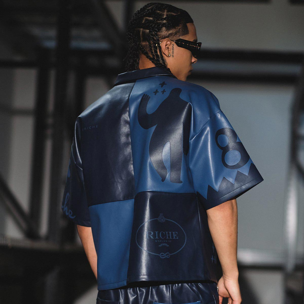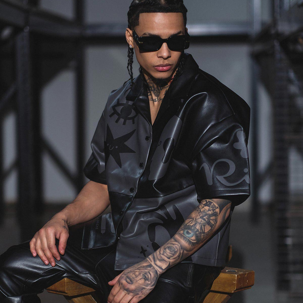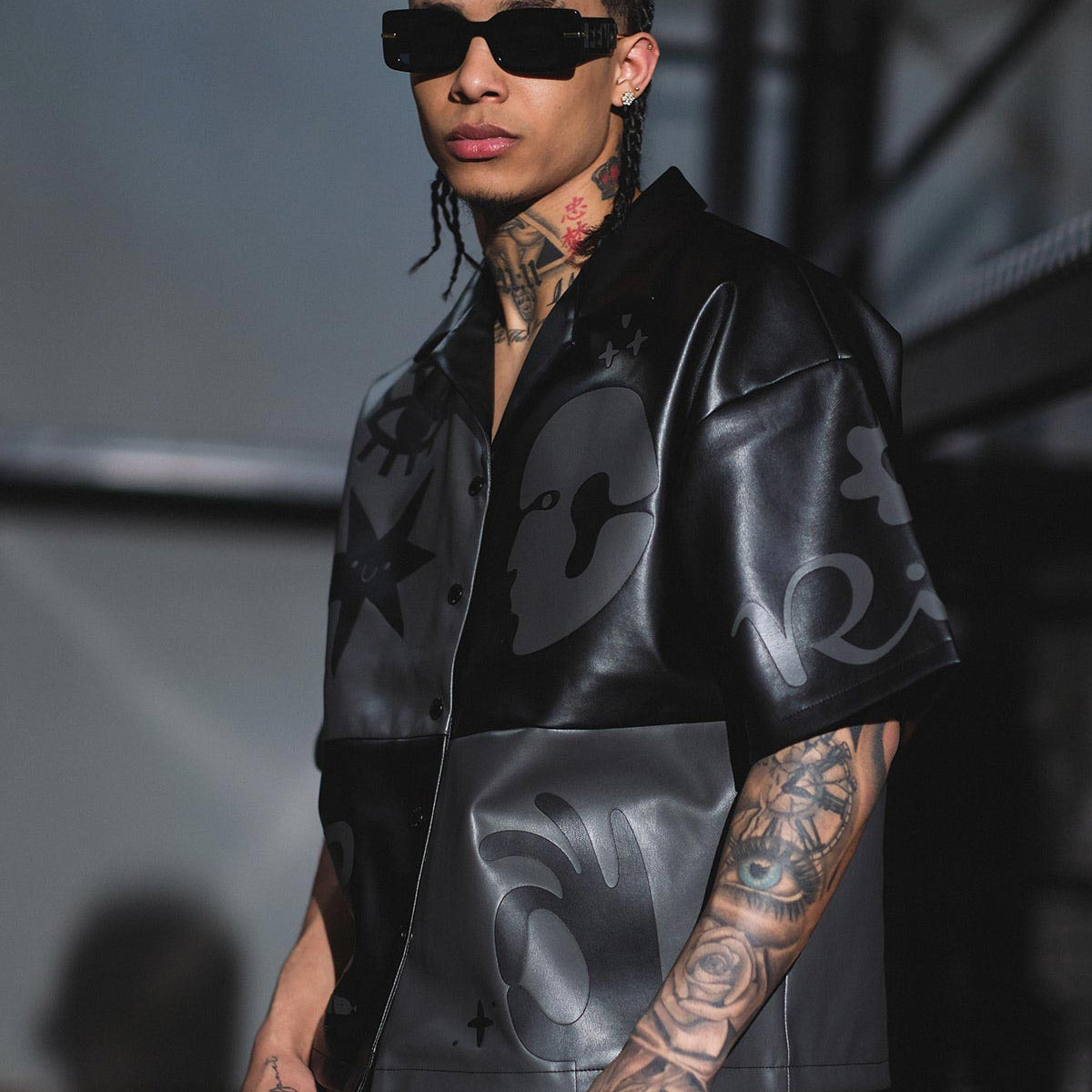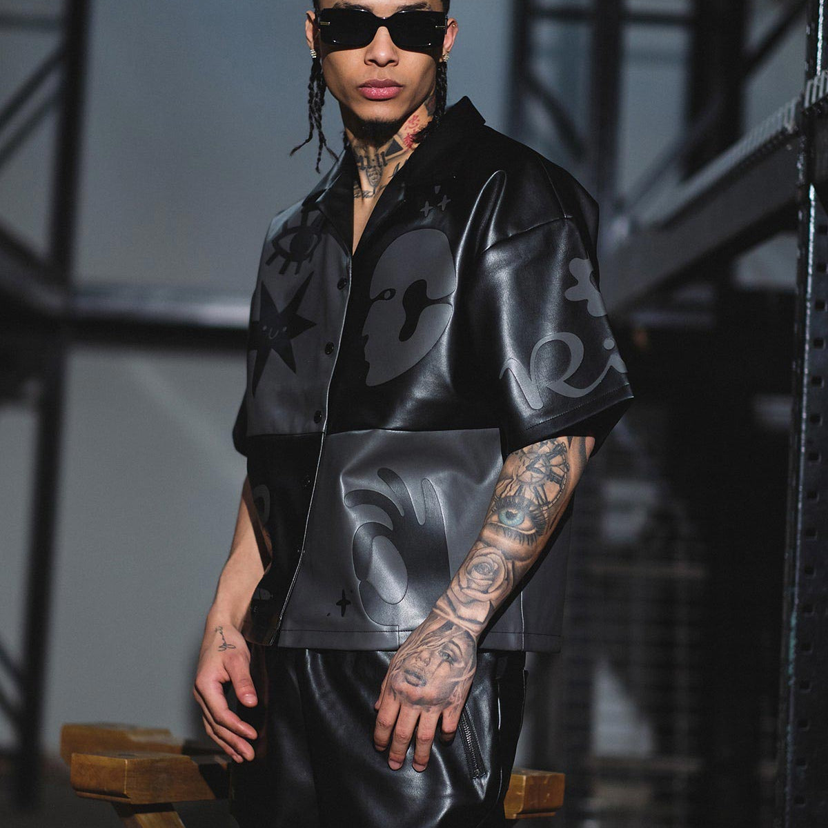 Vegan leather pants with contrast panels, self-fabric graphics all over, and zippered expandable leg opening at bottom.