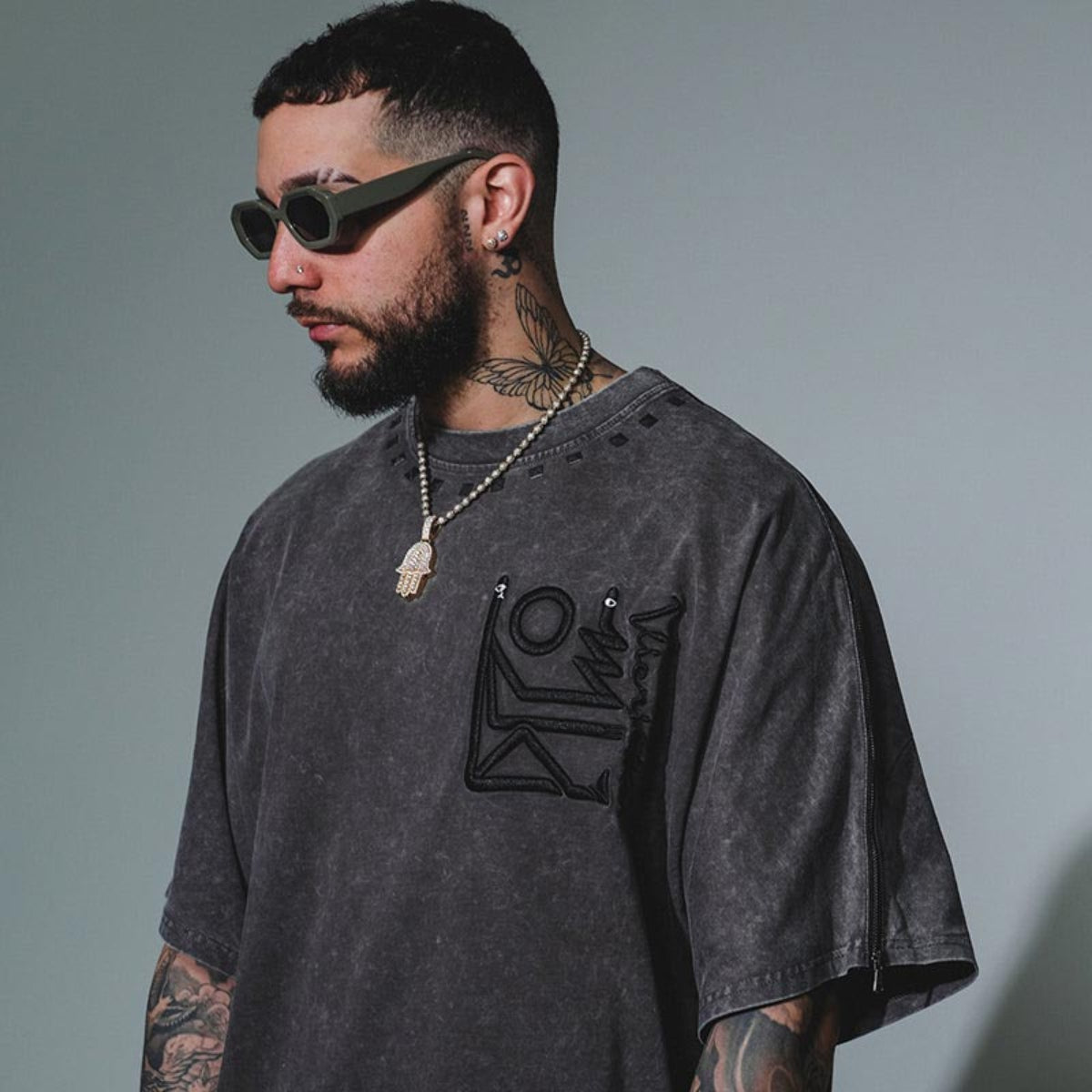 100% Fine knit heavyweight cotton jersey tee shirt with acid wash effect, embroidered graphics on front and back, and zippered seams for interchanging front and back with other styles.